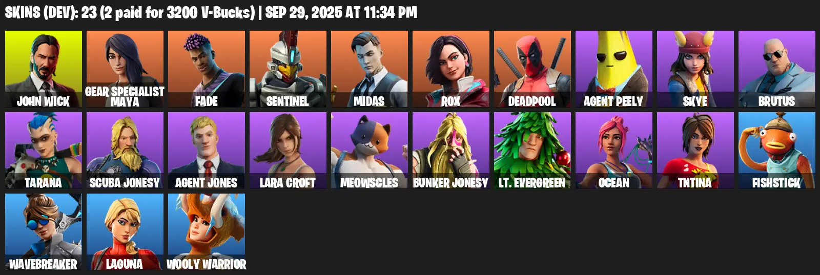 [PC/PSN/XBOX] | 23 skins | 650 V-bucks | Lara Croft | John Wick | Gear Specialist Maya | Fade | Sentinel | Midas | Rox | Deadpool | Agent Peely | S4G