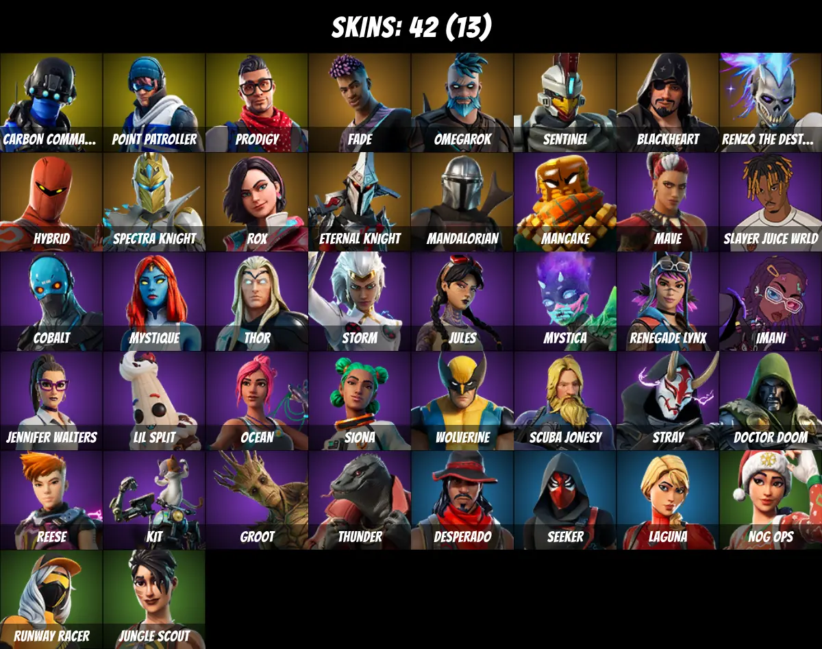 โกPC/PSN/XBOXโก 42 skins ๐ Mandalorian ๐ Jules ๐ Renzo the Destroyer ๐ Thor ๐ Wolverine ๐ Mystique ๐ Doctor Doom ๐ Slayer Juice Wrld ๐ Nog Ops ๐ Prodigy ๐ Hybrid ๐ Spectra Knight ๐ Fade ๐ Sentinel ๐ Eternal Knight ๐ Carbon Commando ๐ 400 V-Bucks ๐