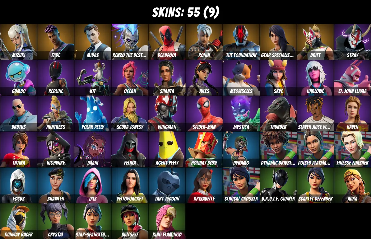 โกPC/PSN/XBOXโก 55 skins ๐ Drift ๐ Deadpool ๐ Midas ๐ Jules ๐ Aura ๐ Agent Peely ๐ Spider-Man ๐ Focus ๐ Renzo the Destroyer ๐ Meowscles ๐ Crystal ๐ TNTina ๐ Brutus ๐ Dynamo ๐ Slayer Juice Wrld ๐ Skye ๐ Mizuki ๐ Ronin ๐ Fade ๐ The Foundation ๐ 300 V-Bucks ๐