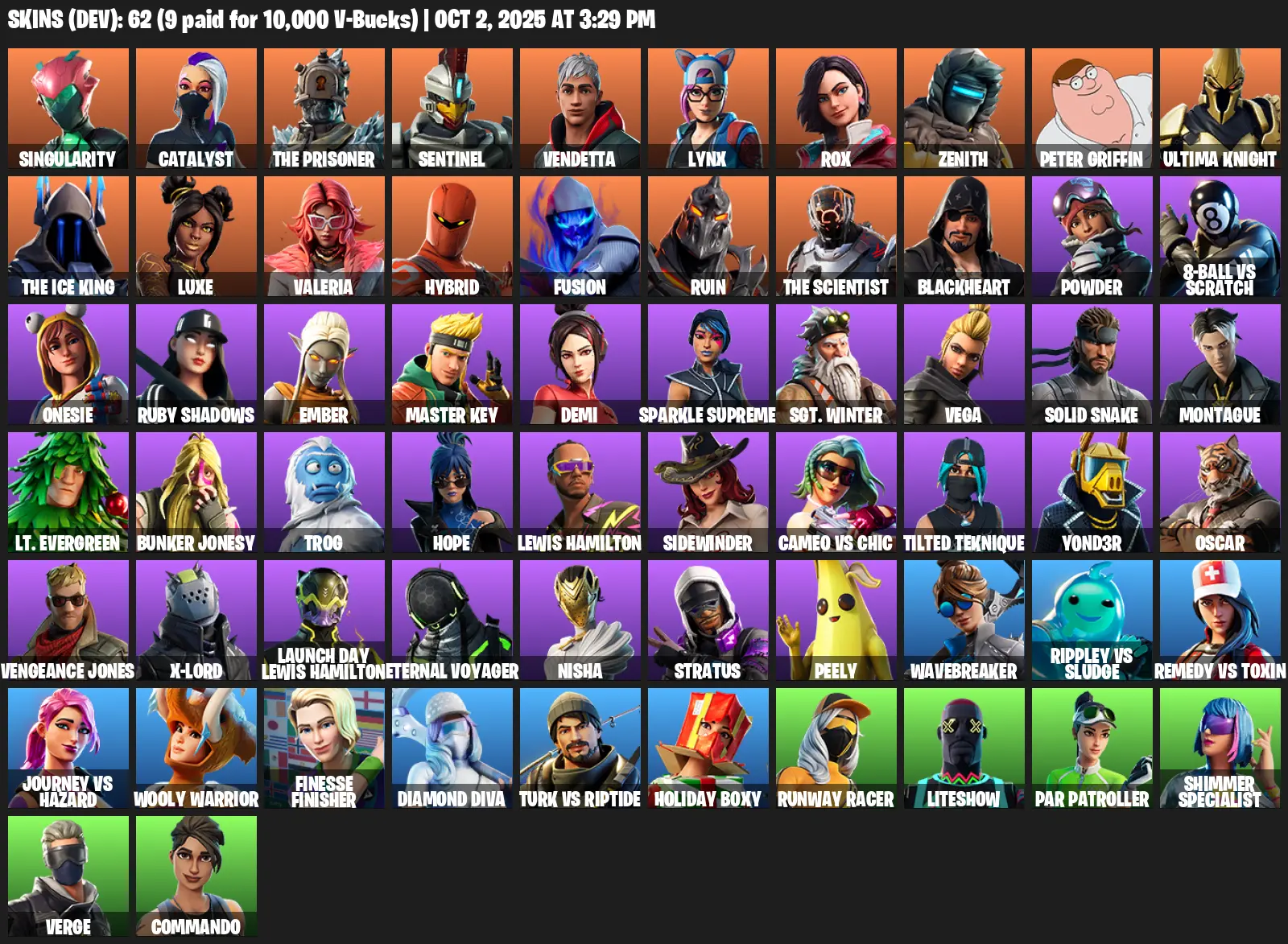 [PC/XBOX/PSN] 62 Skins | Singularity | Catalyst | The Prisoner | Sentinel | Vendetta | Lynx | Rox | Zenith | Peter Griffin | Ultima Knight | The Ice King | Luxe | Valeria | Hybrid | Fusion | Ruin | The Scientist | Blackheart | Powder | 8-Ball vs Scratch