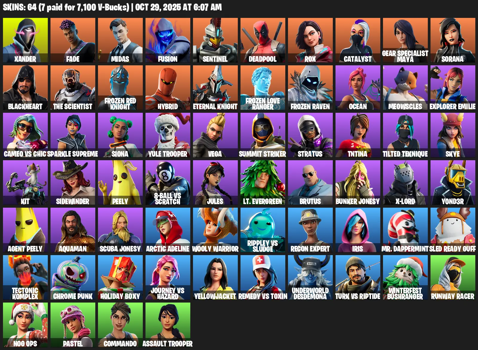[PC/XBOX/PSN] 64 Skins | Xander | Fade | Midas | Fusion | Sentinel | Deadpool | Rox | Catalyst | Gear Specialist Maya | Sorana | Blackheart | The Scientist | Frozen Red Knight | Hybrid | Eternal Knight | Frozen Love Ranger | Frozen Raven | Ocean
