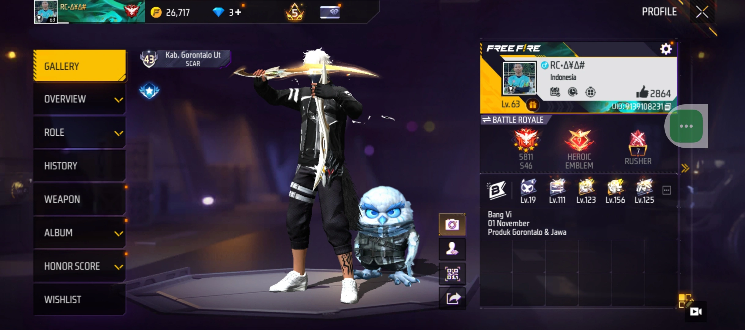 FF209|LV 63/197 WEAPON (4 EVO + 42 MYTHIC)/P90 ⸱ GILDED CORROSION LV. 4/M1887 ⸱ STERLING CONQUEROR LV. 5/SCAR ⸱ MEGALODON ALPHA LV. 6/XM8 ⸱ DESTINY GUARDIAN LV. MAX/146 COSTUME (29 MYTHIC)/60 EMOTE (27 MYTHIC)/31 BACKPACK