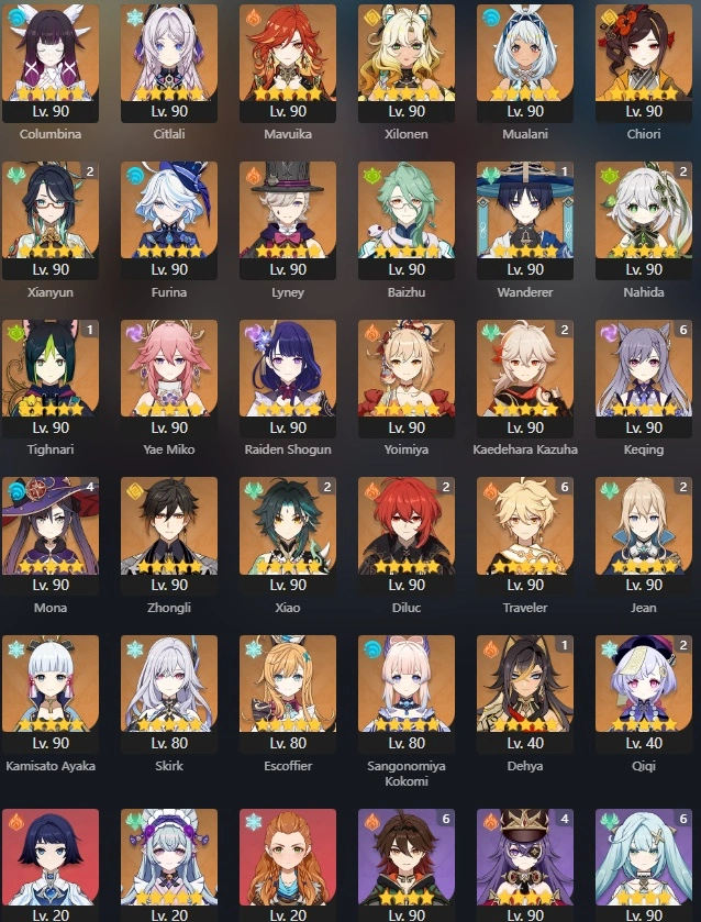 #GK605 Europe AR60 | LEG:86|Skirk+Signa,Escoffier+Signa,Columbina,Furina,Mavuika+Signa, Xilonen,Mualani,Xiao C2+Signa,Keqing C6, Mona C4, Xianyun C2+Signa, Nahida C2+Signa, Kaedehara Kazuha C2