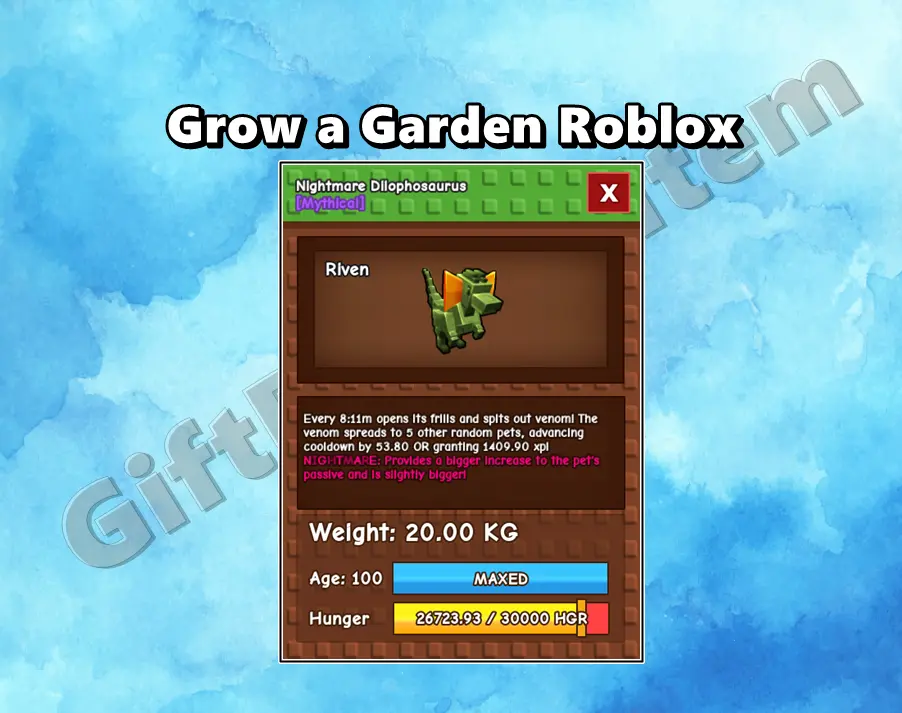 Comprar Agora Mutation Nightmare Dilophosaurus 20Kg ++ Age 100 Grow a Garden