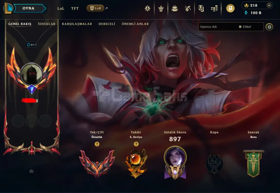 【TR】 ⸱ 💸GrandMaster 300 LP ⸱ 🍁817 Level ⸱ 🔥800 SKİNS ⸱ 👑All Champions⸱ 🔷100K BE ⸱ 🎖️Honor 5 ⸱ 🚫Beta Challenger Icon ⸱ 📮Full Recovery Email ⸱ ⏱️
