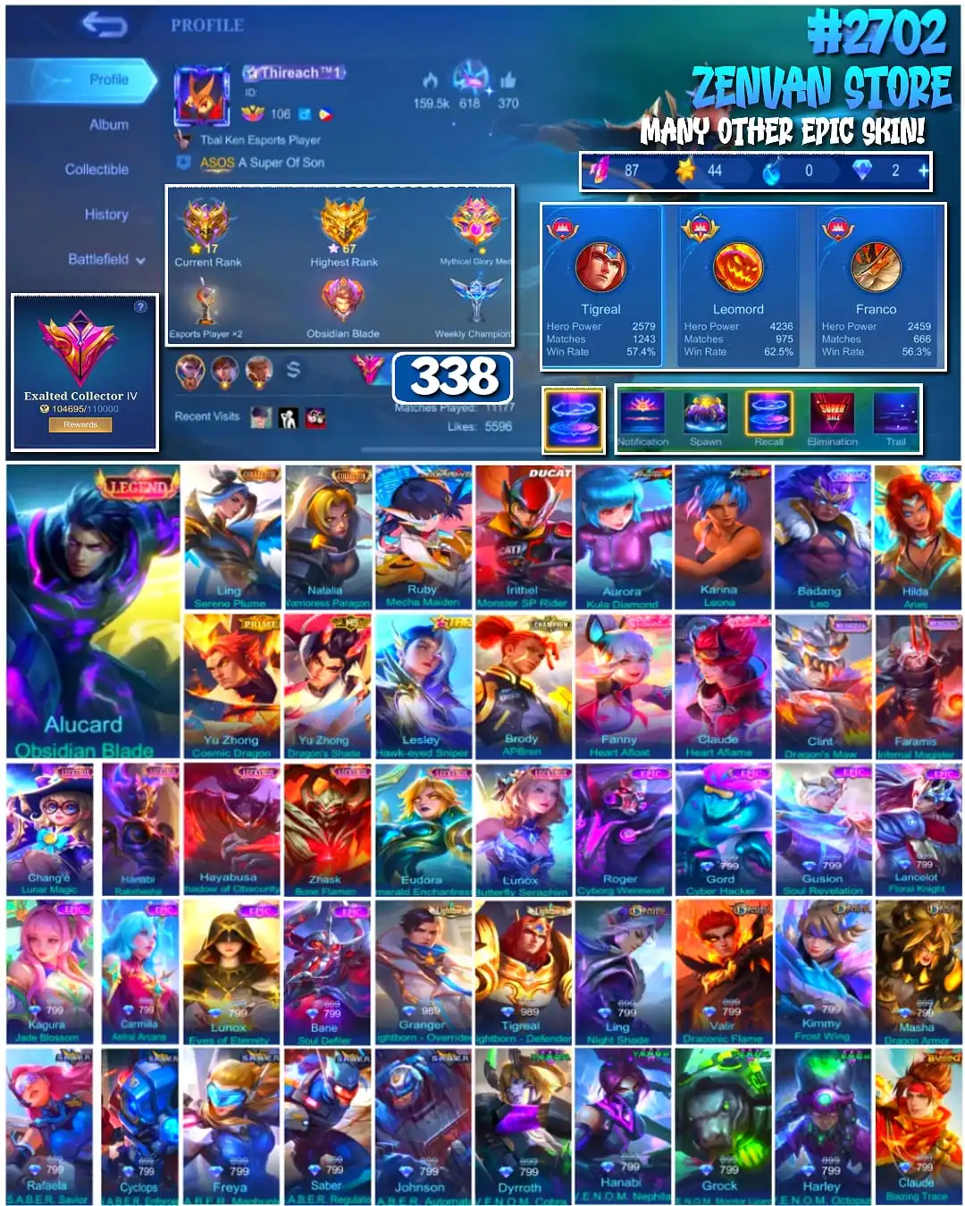 #2702 🔥 338 Skins 🔥 Leg end Alucard 🔥 Collector Ling & Natalia 🔥 Aspirant Ruby 🔥 Ducati Irithel 🔥 Prime Yu Zhong 🔥 Champion Brody 🔥 KoF Karina & Aurora 🔥 Many Limited 🔥 Many Epic 🔥 Safe Account
