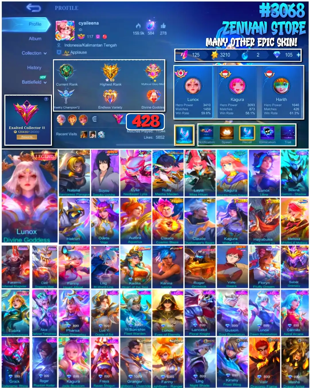 #3068 🔥 428 Skins 🔥 Legend Lunox 🔥 Collector Natalia 🔥 Sasuke, Neobeast Lylia 🔥 Aspirant Ruby & Layla 🔥 Transformers Roger 🔥 KoF Karina 🔥 Many Limited 🔥 Many Epic 🔥 Safe Account ✅