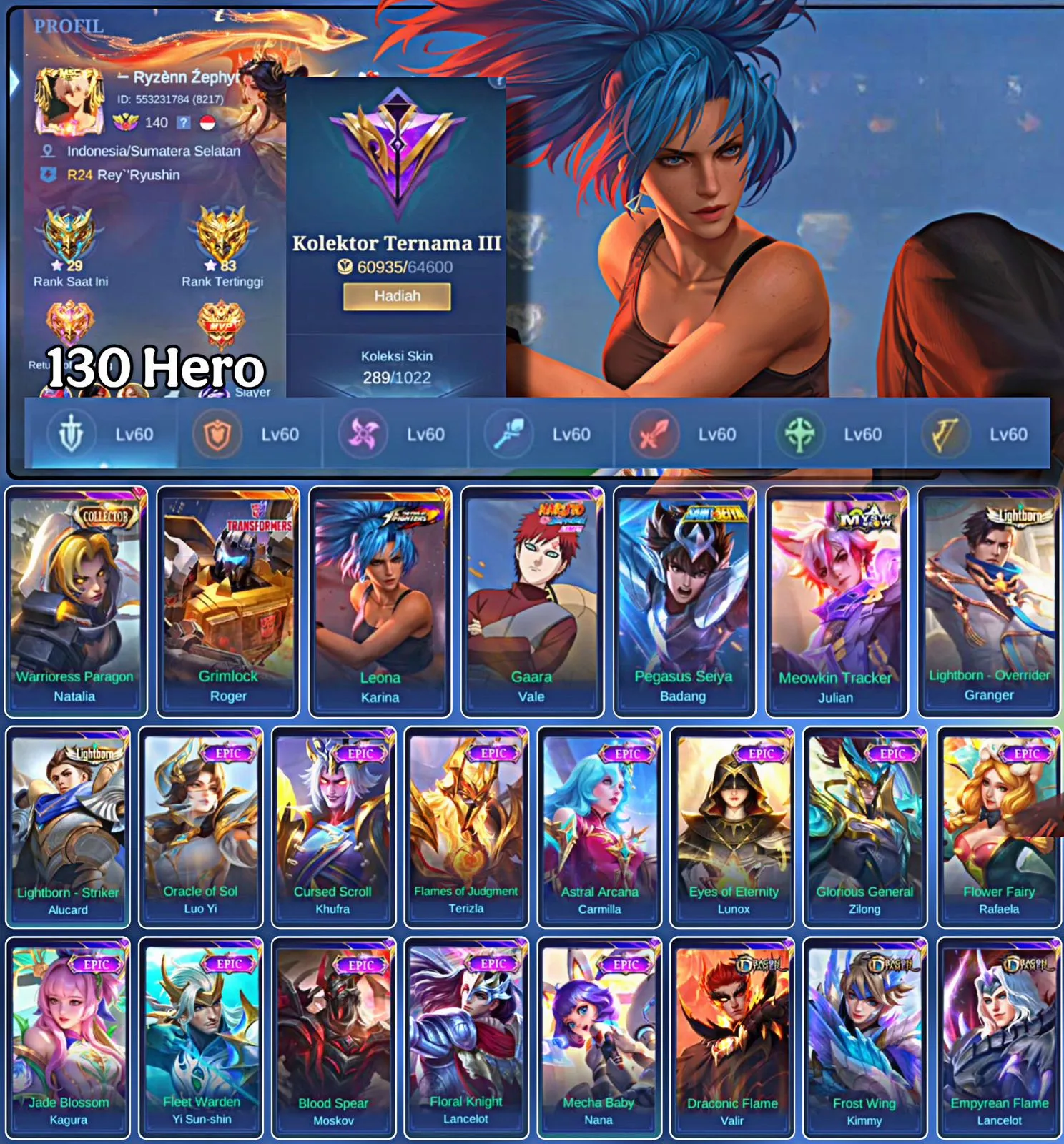 HERO 130 SKIN 289 | EMBLEM ALL MAX | COLECTOR NATALIA | VALE GARA | KOF KARINA | EPIC KHUFRA| HERO GOOD | SKIN GOOD | INSTAN DELIVERY