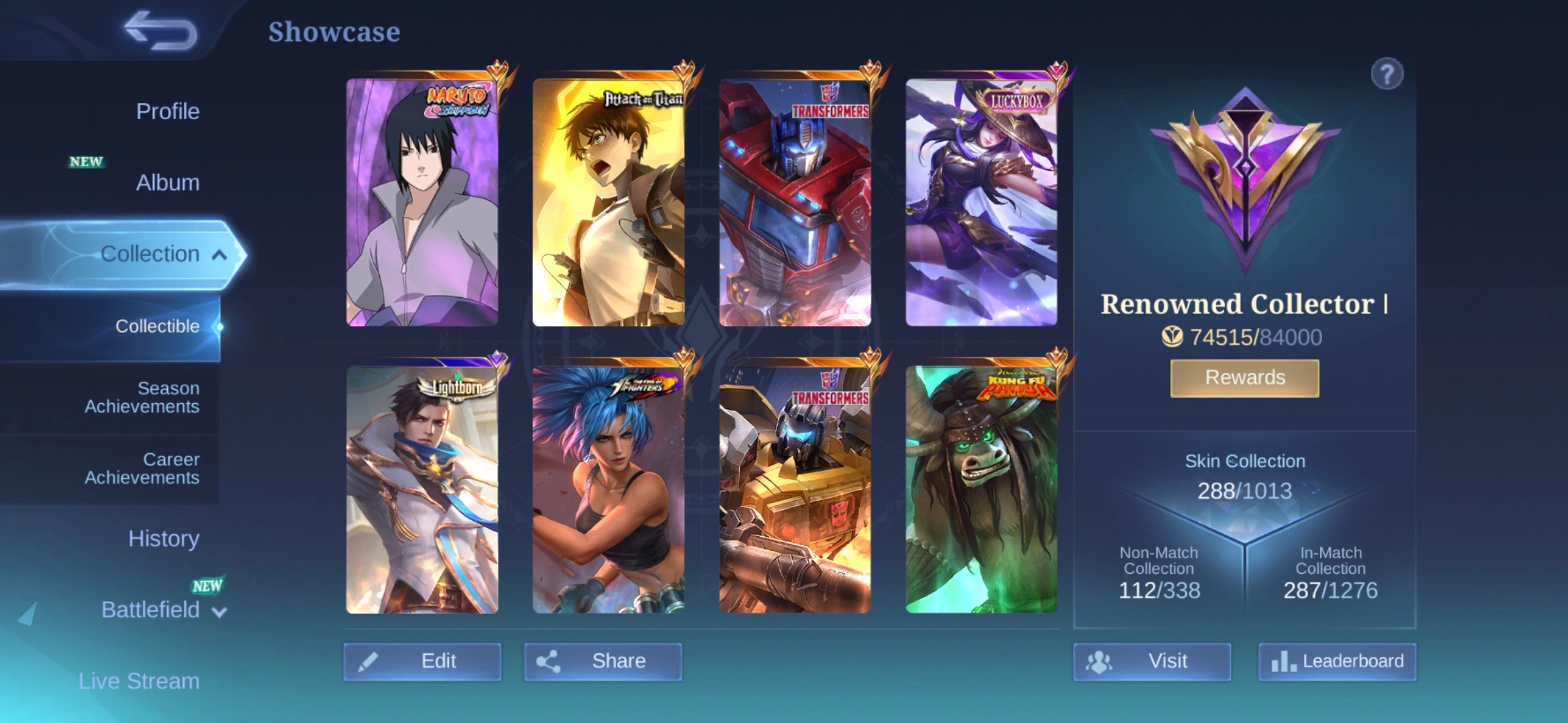 MB825|LV102|HERO 129|SKIN 288|RENOWNED COLLECTOR 1|SUYOU SASUKE UCHIHA|ROGER TRANSFORMERS|JOHNSON OPTIMUS PRIME|YIN EREN AOT|THAMUS KUNGFU PANDA|KARINA KOF|FANNY LUCKYBOX|HILDA ZODIAC|EUDORA ATOMIC|BADANG SEIYA|VALE GAARA|8 EPIC