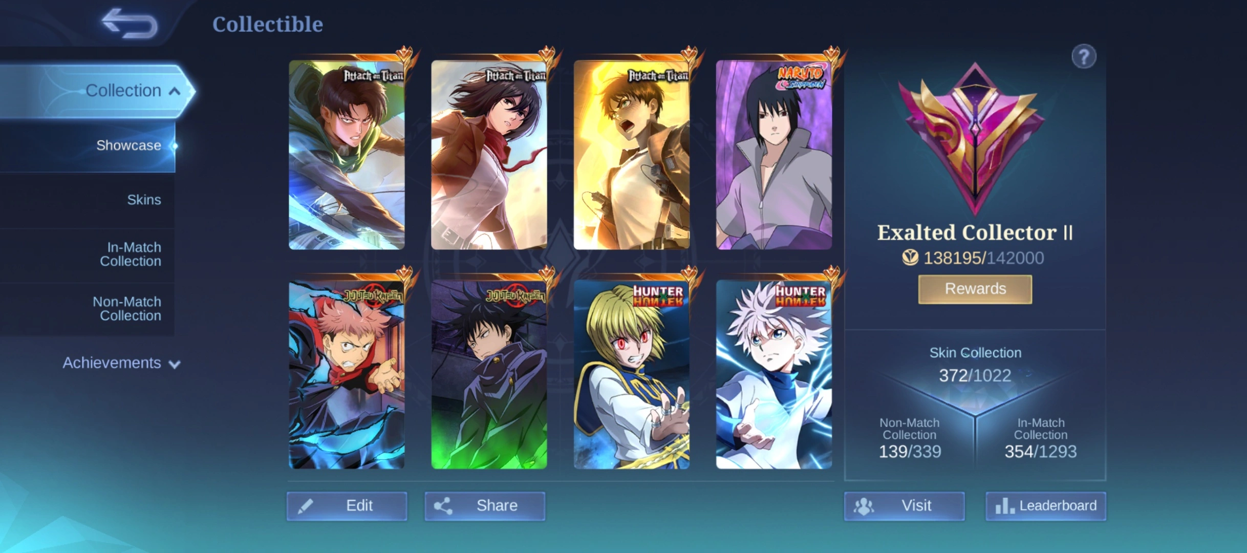 N266|LV 149|EXALTED COLLECTOR II|372 SKIN|2 LEGEND(GRANGER,FREYA)SUYOU SASUKE|GS 11.11|3 AOT|2 JJK(YIN,JULIAN)2HXH(HARITH,JULIAN)MOSKOV INFERNAL
