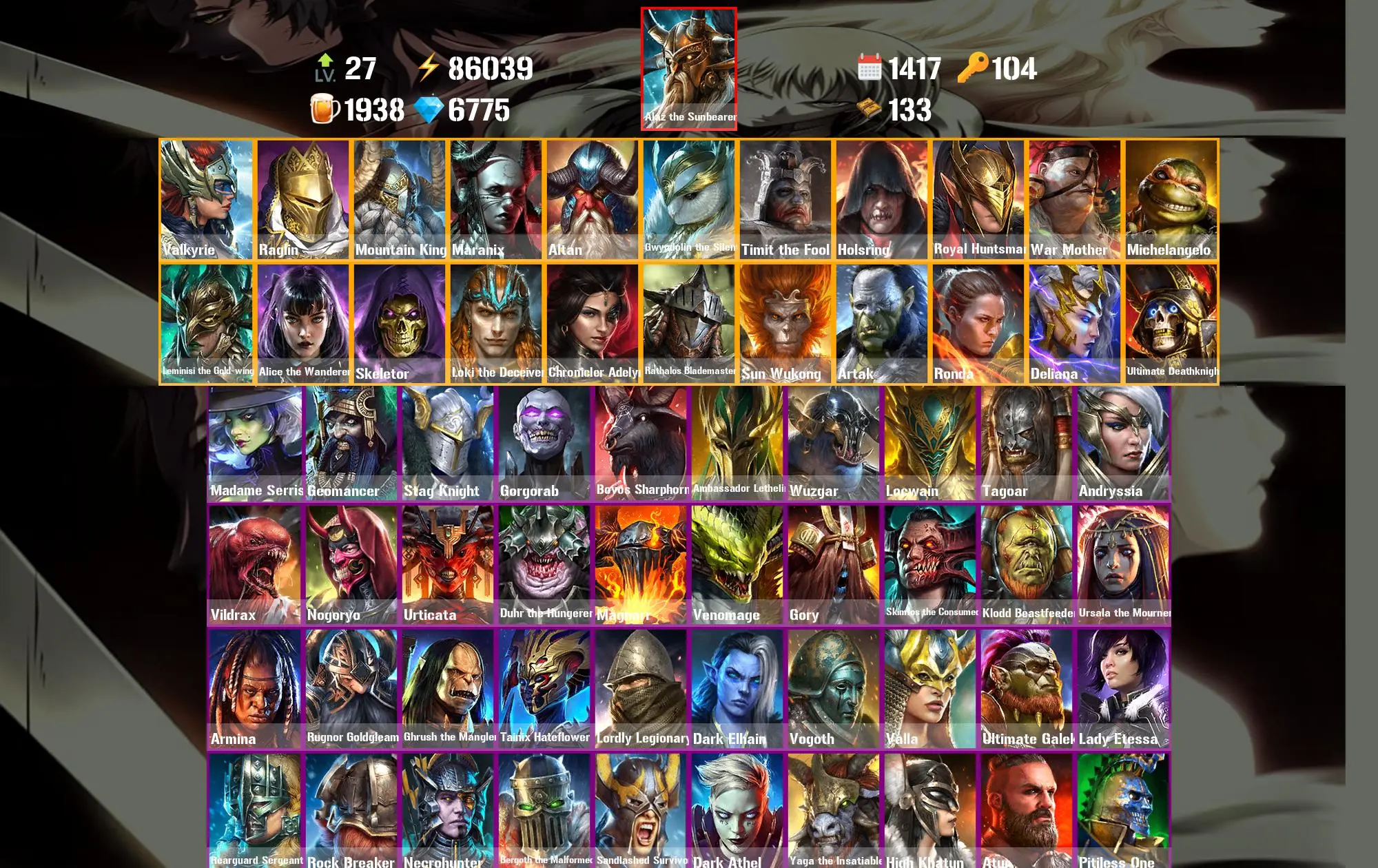 1417 Days 86.0k Energy [Mythical Starter] Alaz the Sunbearer ⸱ Valkyrie ⸱ Raglin ⸱ Mountain King ⸱ Maranix ⸱ Altan ⸱ Madame Serris ⸱ Geomancer ⸱ 54.5m Silver ⸱ 6.8k Gems