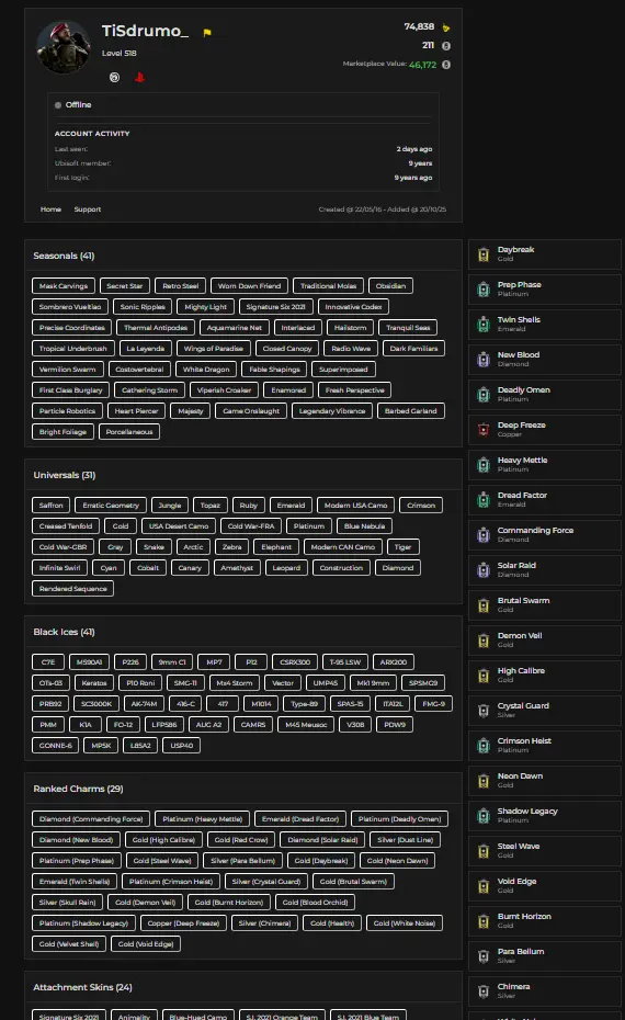 🎮 PC/PSN CROSS-PLATFORM | 650+ skins | LEVEL 518 | 75K RENOWN | 41 BLACK ICE | 46 LEGENDARY | 183 EPIC | ULTIMATE COLLECTOR ACCOUNT