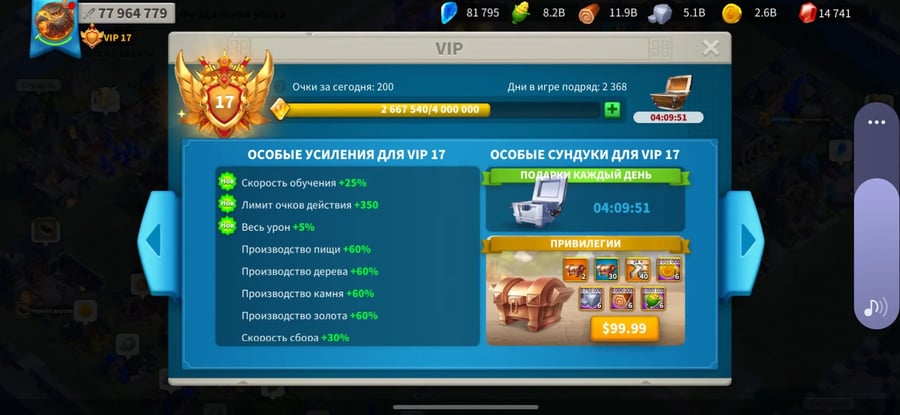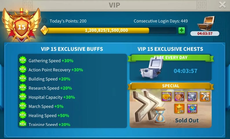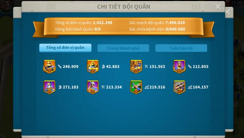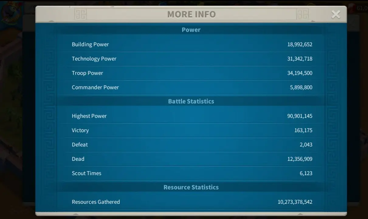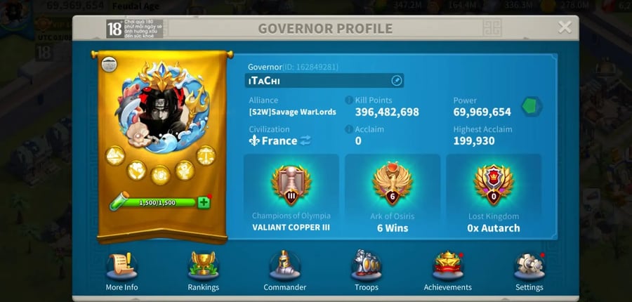 89M POW ⸱ Vip 17 ⸱ 2,2B Kill Points ⸱ 74 Passport (Ready to move) 4M TROOP ⸱ 3x Autarch ⸱ 2 Skin House: Hawa Mahal ⸱ Twilight Falls ⸱ 8B RSS ⸱ 2,019 Days SP ⸱ 33 Gear ⸱ 314 Gold Head ⸱ Max 22 Commanders + Farm 9M POW