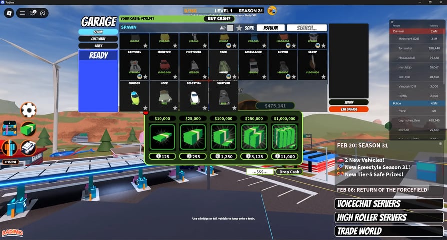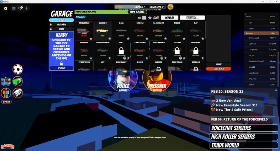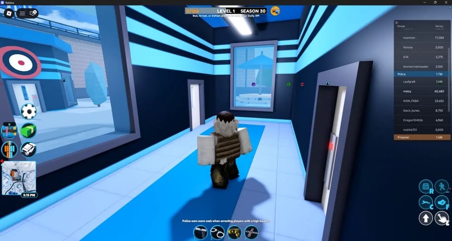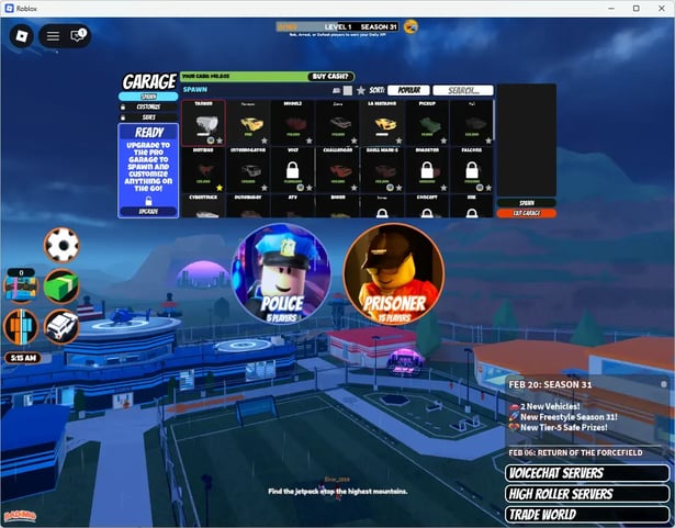 Criminosos escapam da prisão e roubam locais, incluindo bancos, joalherias, museus, aviões de carga e trens para ganhar dinheiro. Oficiais de polícia patrulham o mapa, prendem criminosos para ganhar recompensas por prêmio e recebem salários diários. O dinheiro compra veículos que vão desde carros iniciais gratuitos até opções premium caras, como o Bugatti e a Volt Bike. Armas, incluindo pistolas, espingardas, snipers e lançadores de foguetes, são compradas em lojas de armas com moeda do jogo.