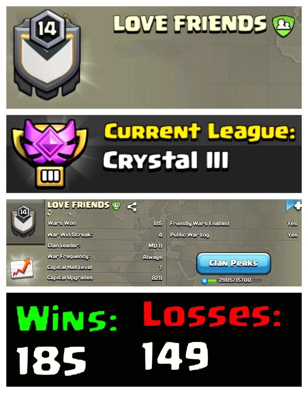 💖 OP LVL 14 ENGLISH CLAN 🌈 LOVE FRIENDS ⚔️ CRYSTAL III 🏯 CLAN CAPITAL 7 🔥 185W/149L 🚀 INSTANT DELIVERY 🛒 BUY NOW #LB