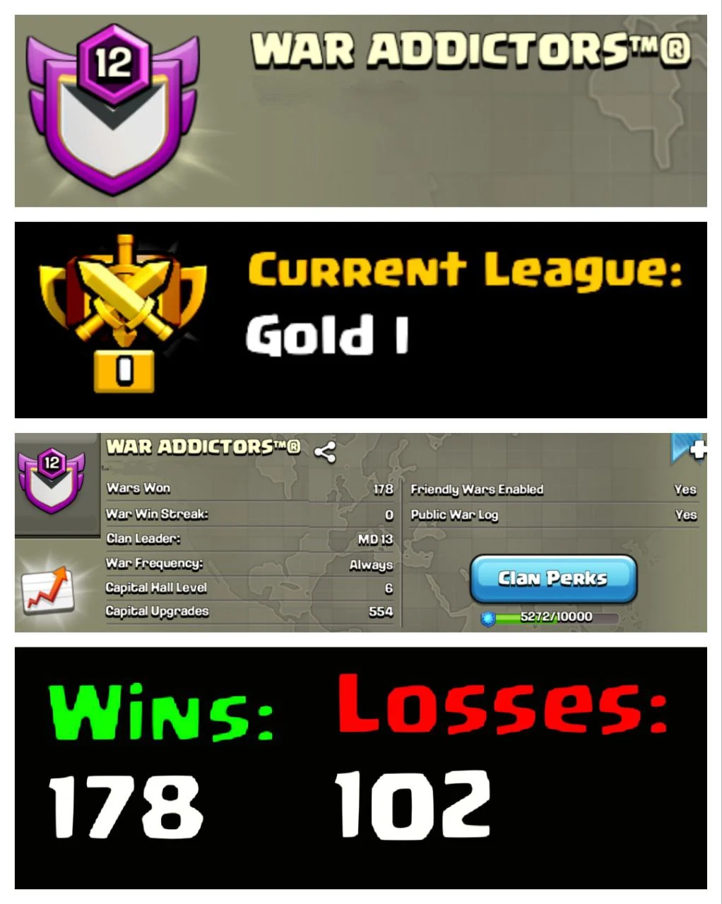 🧨 OP LVL 12 ENGLISH CLAN 🌀 WAR ADDICTORS ⚔️ GOLD I 🏯 CLAN CAPITAL 4 🔥 178W/102L 🚀 INSTANT DELIVERY 🛒 BUY NOW #LB