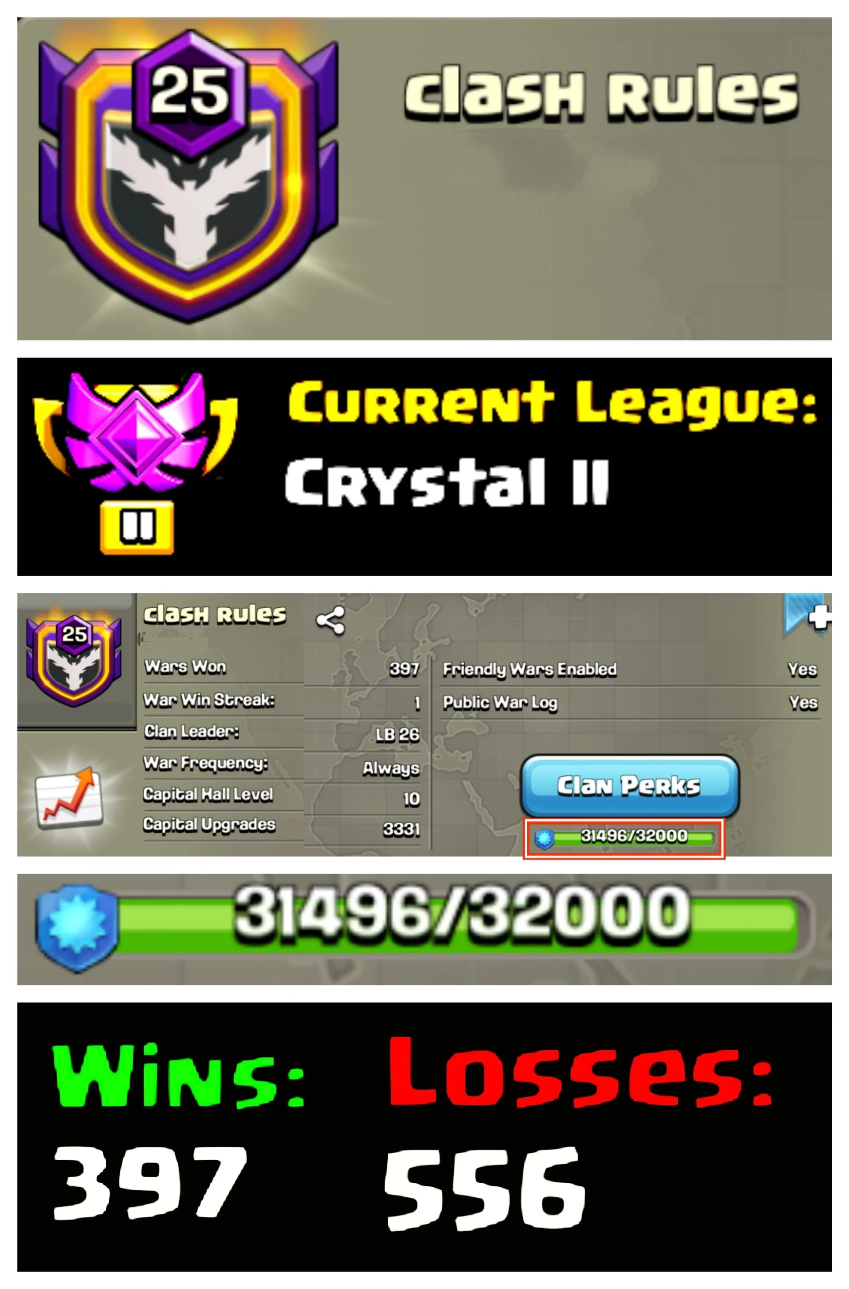 🏆 OP LVL 25 ENGLISH CLAN 🔥 CLASH RULES 💎 CRYSTAL 🏯 CC 10 ⚡ 397W/556L 🚀 INSTANT DELIVERY 🛒 BUY NOW #LB