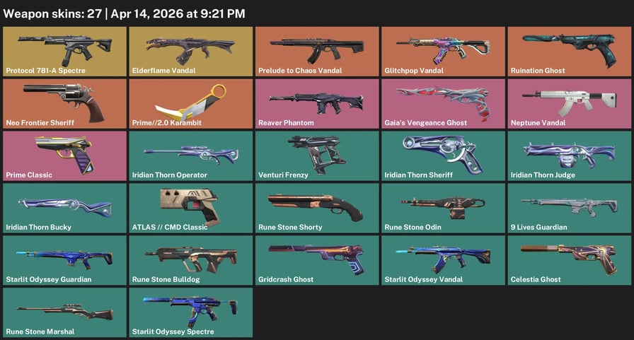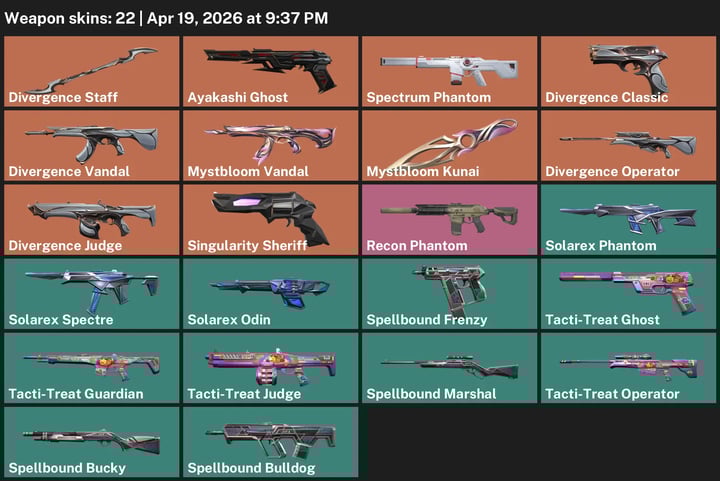 AP / 10 Skins / 15400 VP SPENT / Evori Dreamwings Vandal / Phaseguard Ghost / Chaos Vandal / Mystbloom Sheriff / Reaver Phantom #VA0804