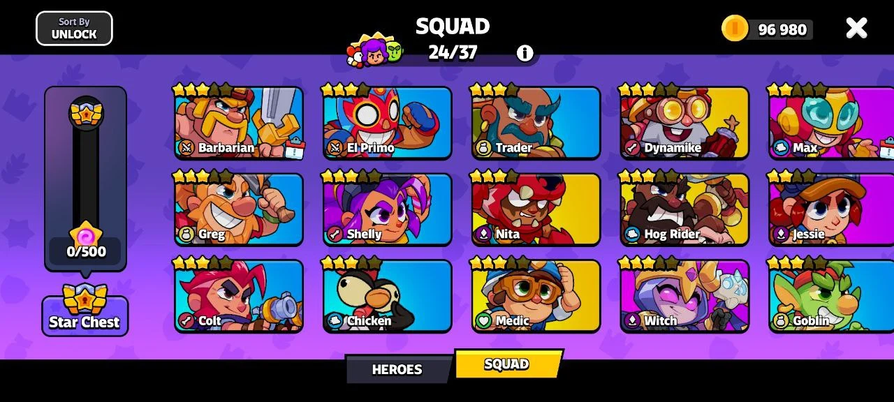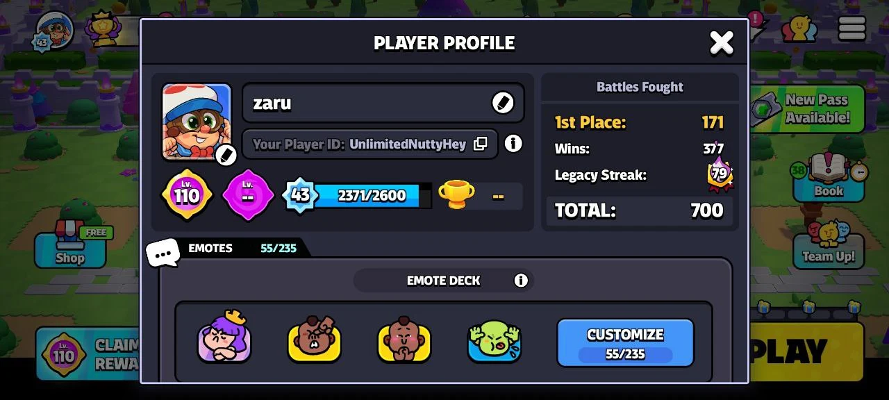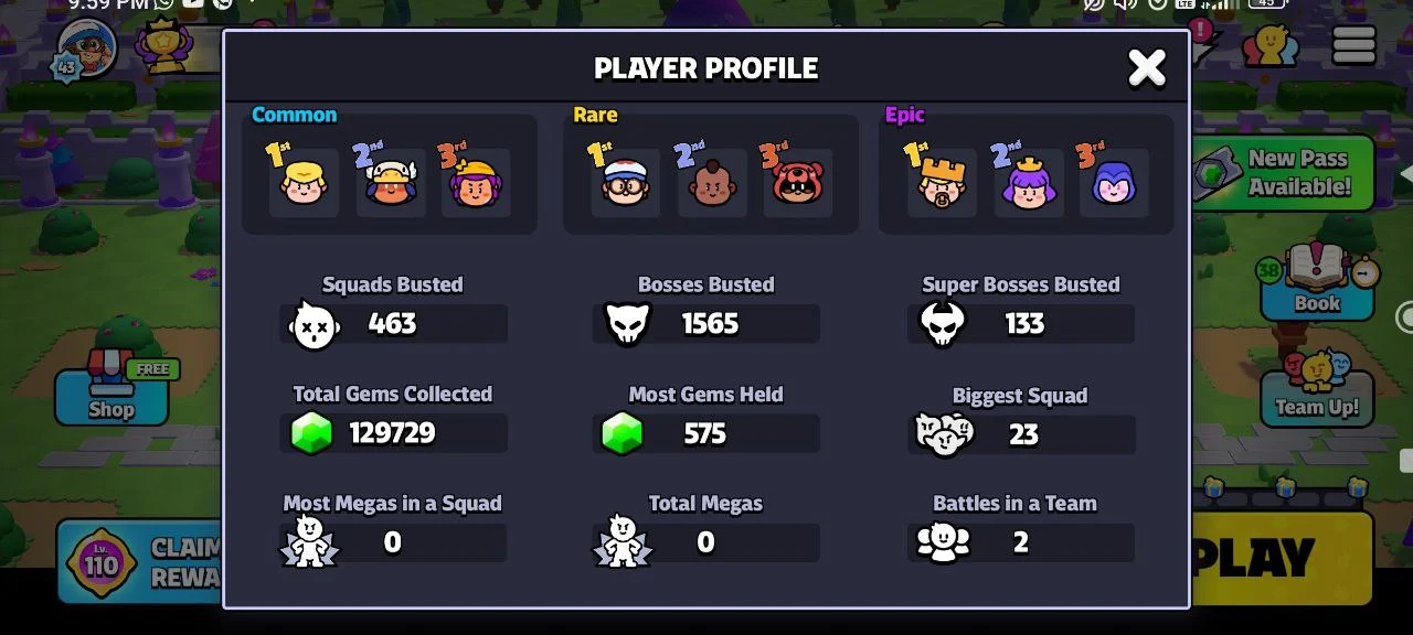 LVL 43 EXP | 110 WORLD JOURNEY 🌍 | 55 EMOTES 🎊 | 24 SQUAD TROOPS ⚔️ | 19 THREE-STAR TROOPS ⭐ | 96,980 GOLD 💰 | 155 HERO POINTS ⚡ | BABY SQUAD STATUE ❤️