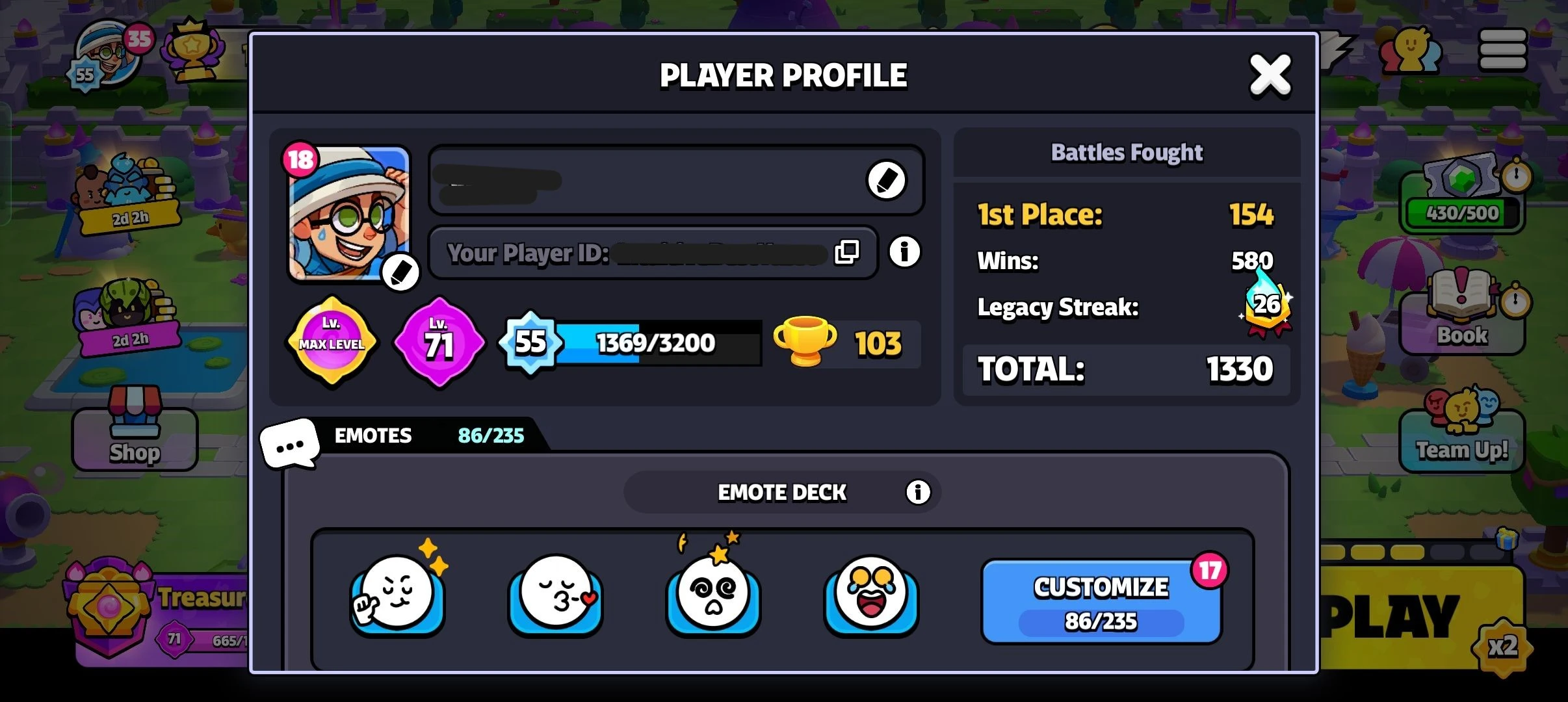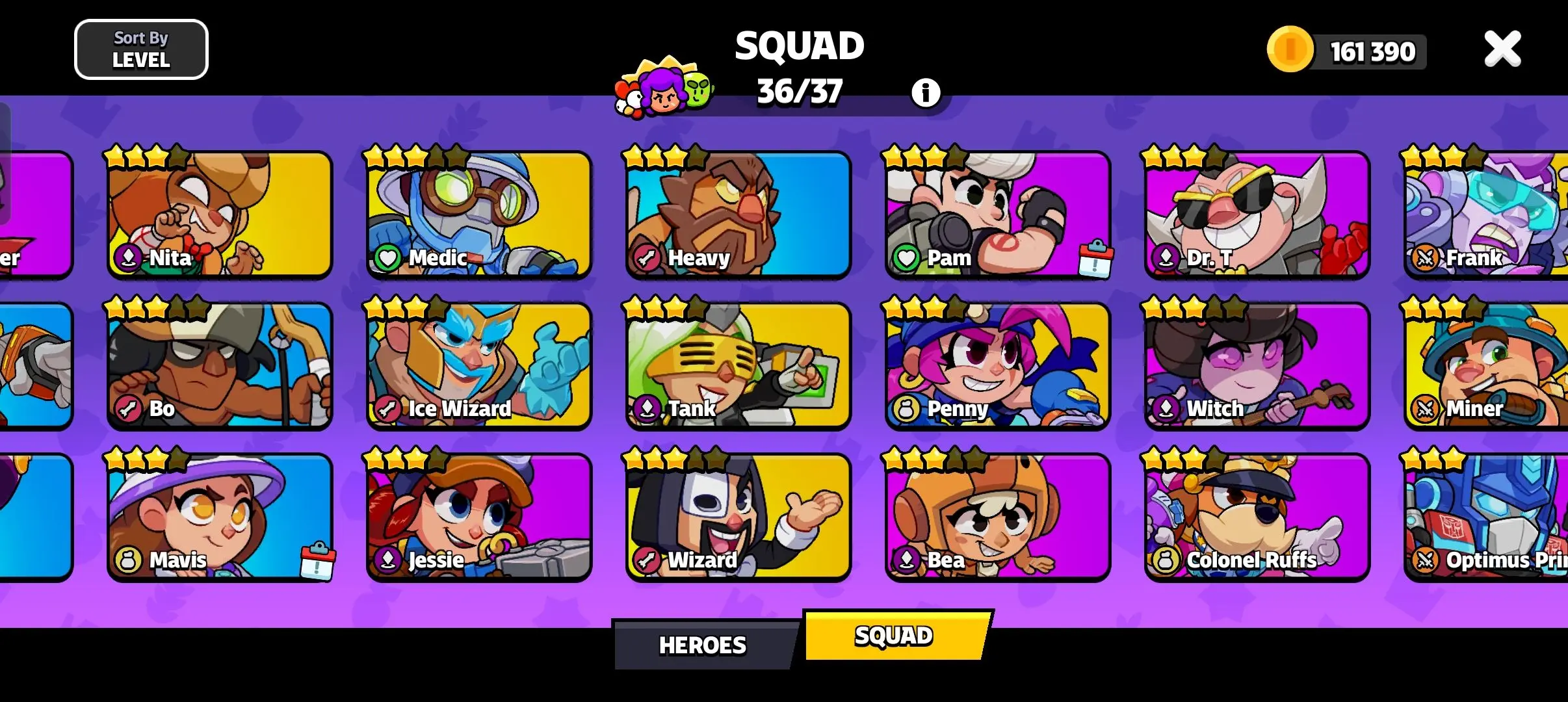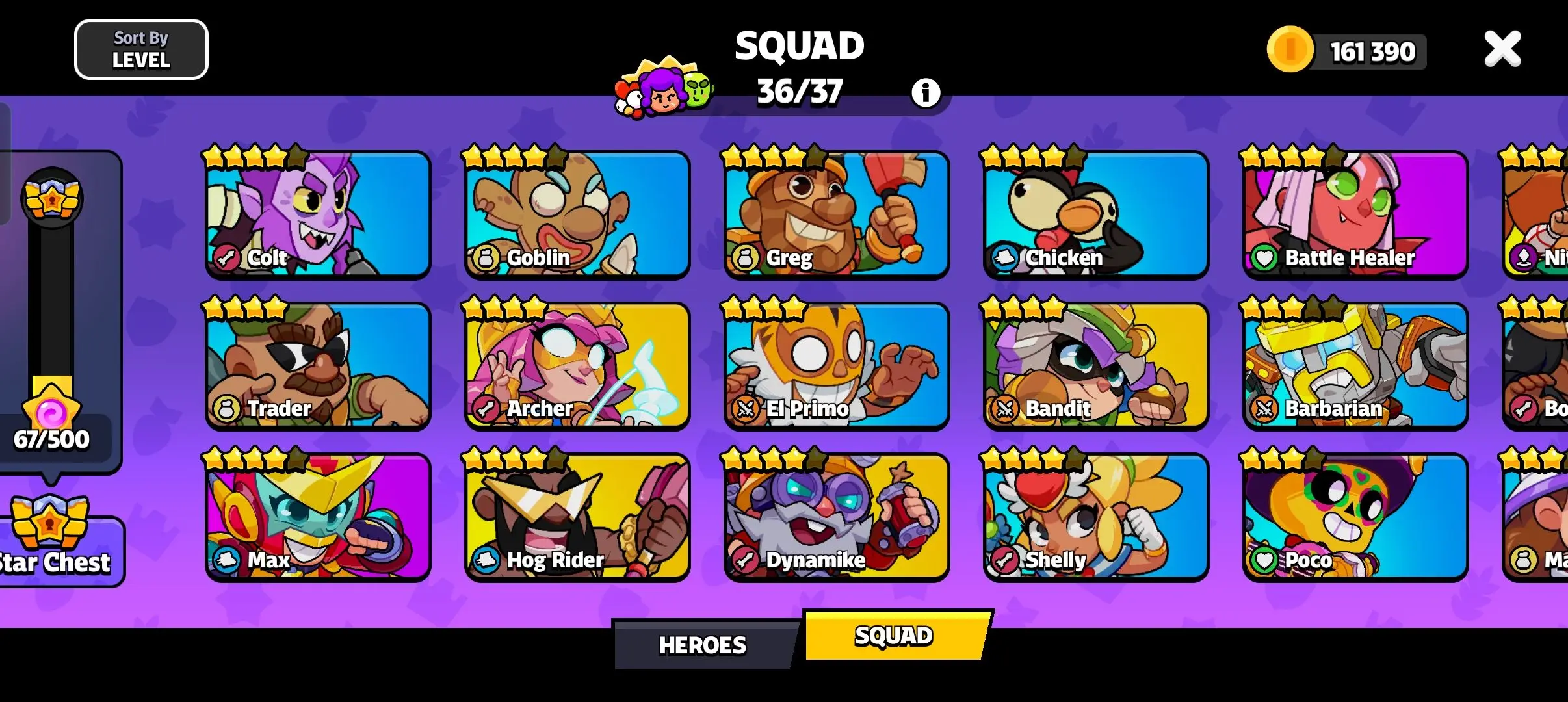 🔥 lvl 71 ✅ Squad league open ✅ 37 characters ( 13 ultra 4 stars ⸱ 20 super 3stars ) ✅ 19 skins ✅ 86 emotes