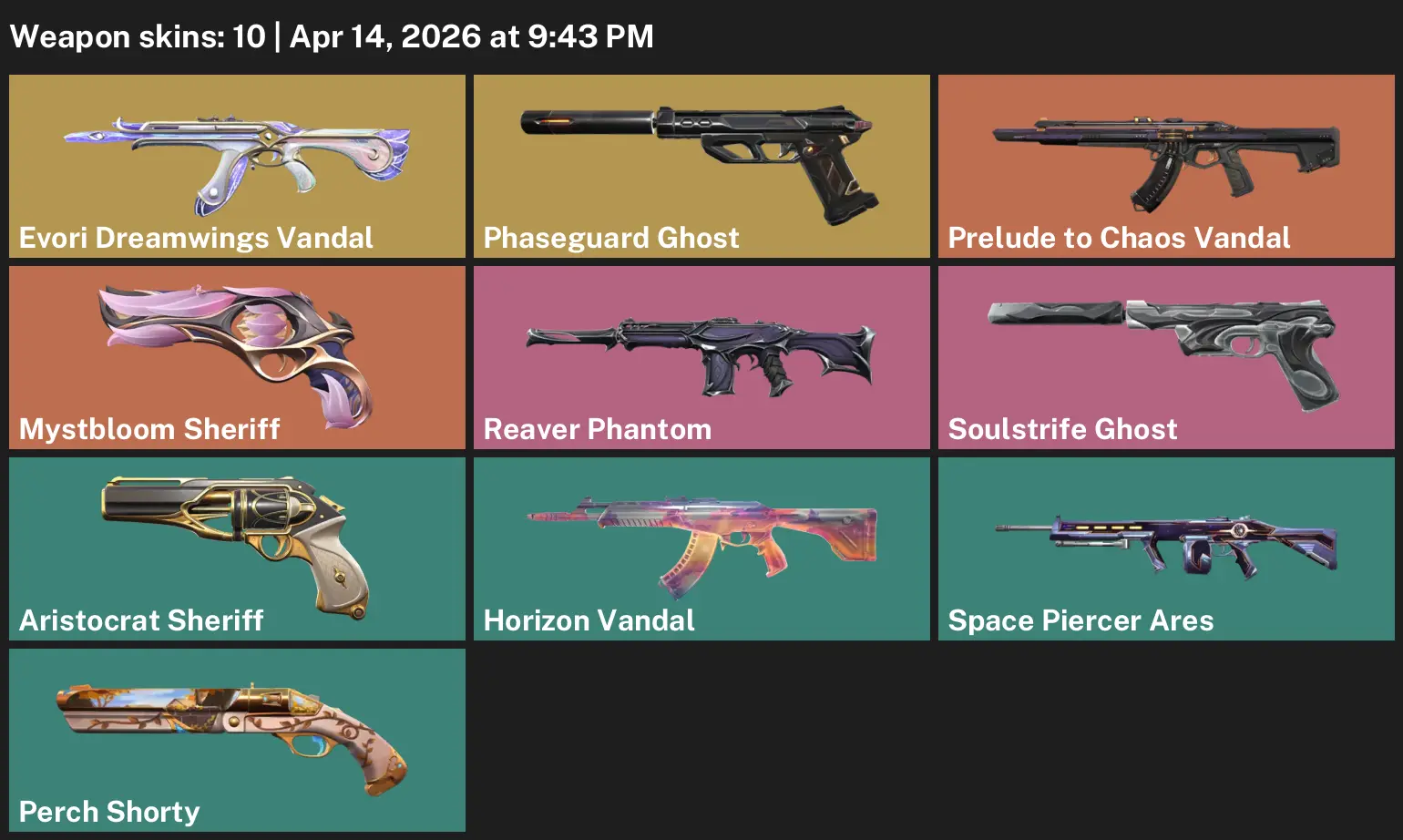AP / 10 Skins / 15400 VP SPENT / Evori Dreamwings Vandal / Phaseguard Ghost / Chaos Vandal / Mystbloom Sheriff / Reaver Phantom #VA0804