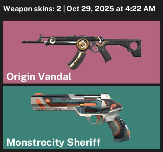 🎾 AP 🚛 Unranked 🎸 2 Skins 👄 285 VP 🪑 9 Agents ⛹️♂️ Value: 1775 VP ⛴ Origin Vandal 🫦 Monstrocity Sheriff