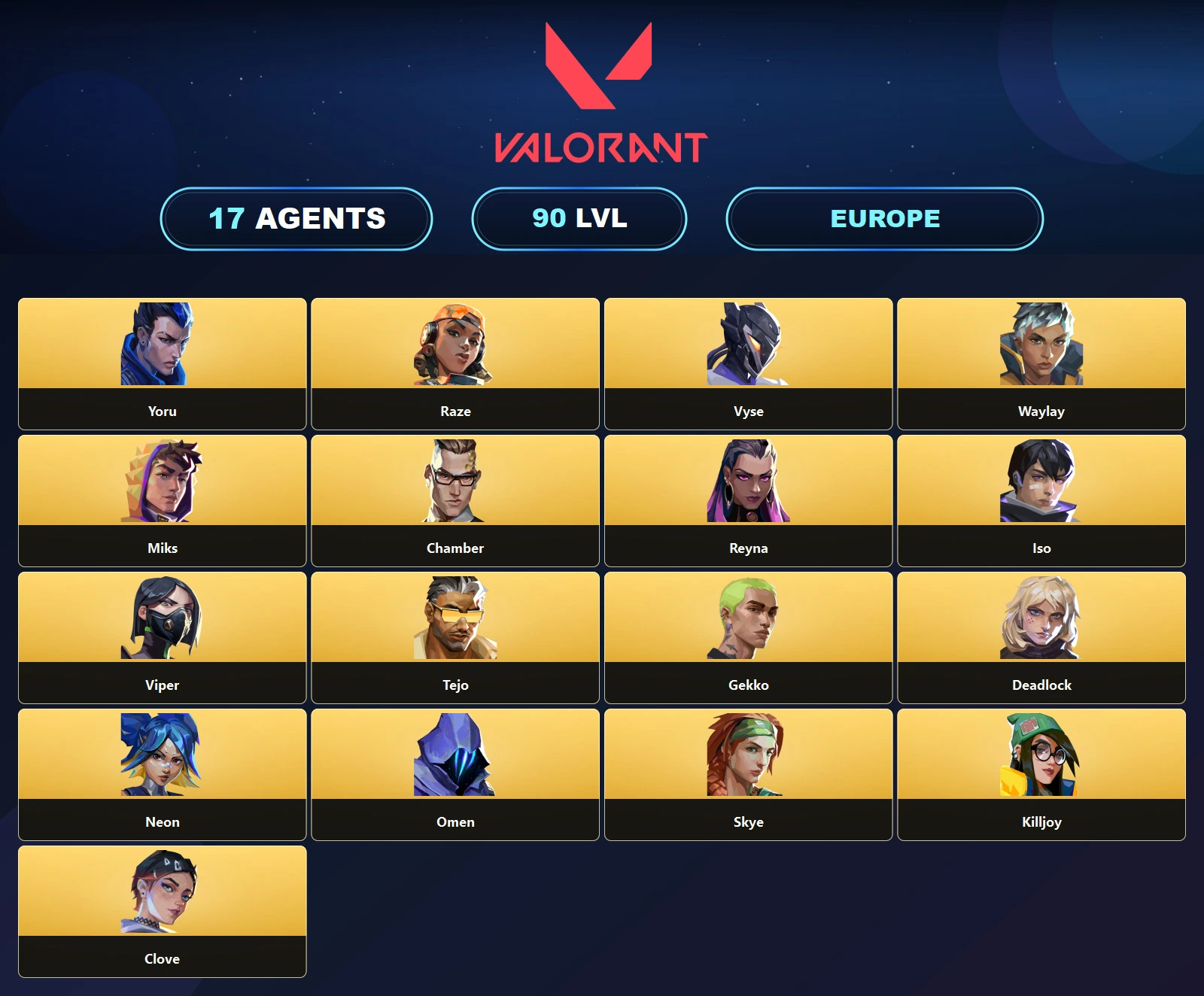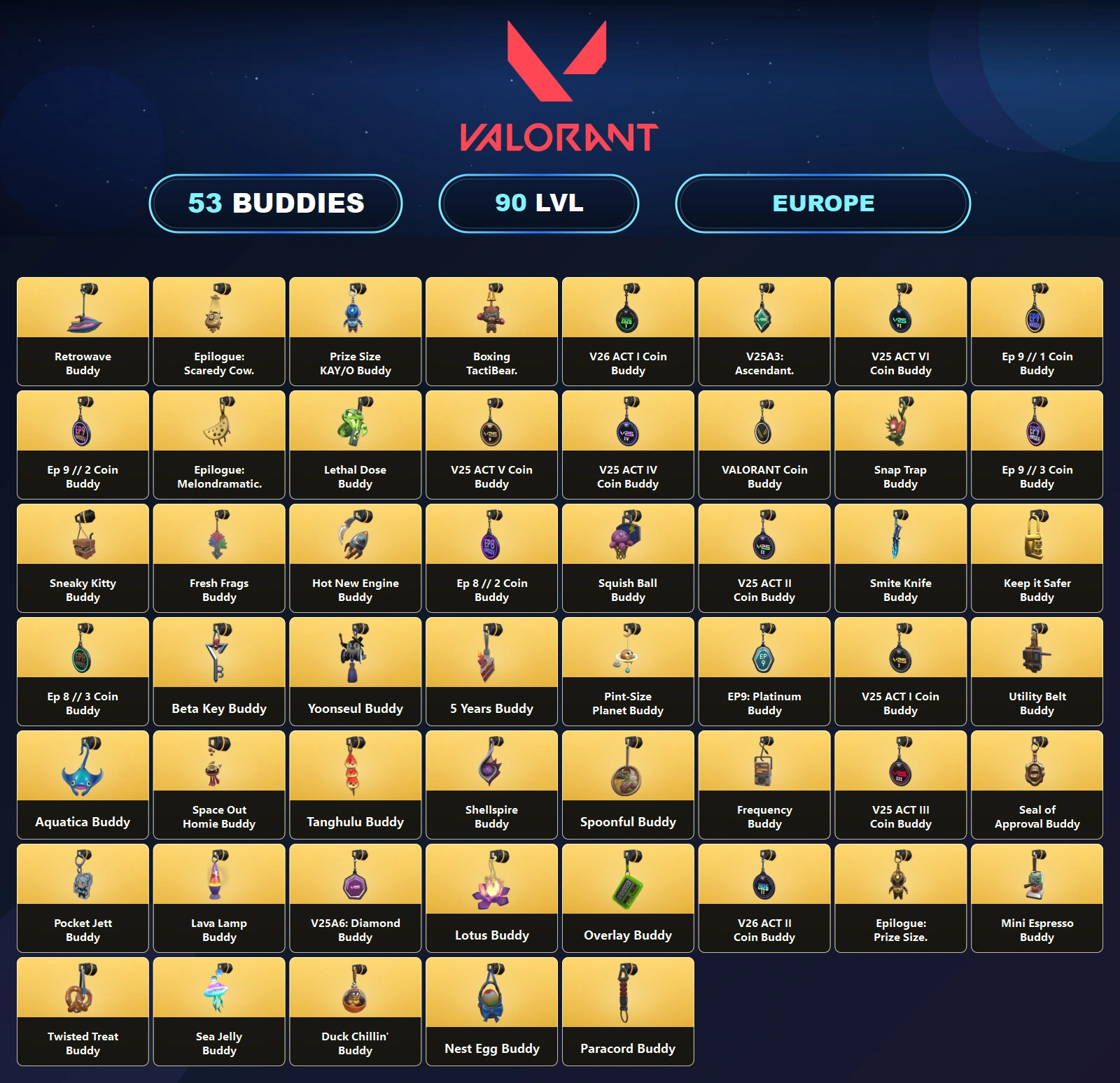 EU 👢 30 Skins 🏁 90 Level 🍋 Champions 2024 Phantom 🌙 Kuronami Sheriff 💠 Prime Classic 🪙 Onimaru Kunitsuna 🔥 Sentinels of Light Vandal 🍒 Overlay Phantom 🐩 Sovereign Marshal 🎯 Diamond 1 🛳 17 Agents