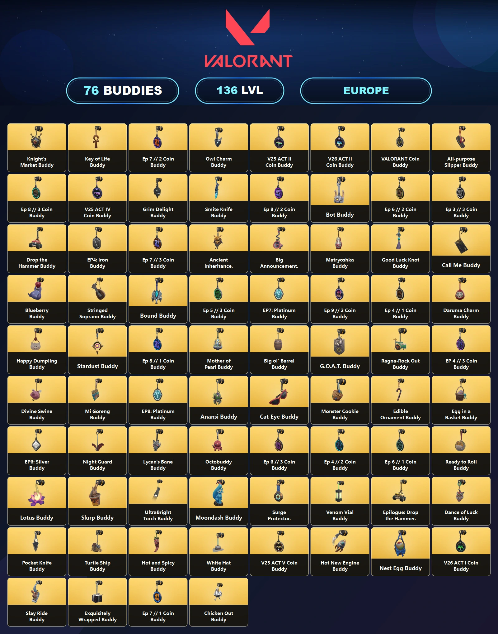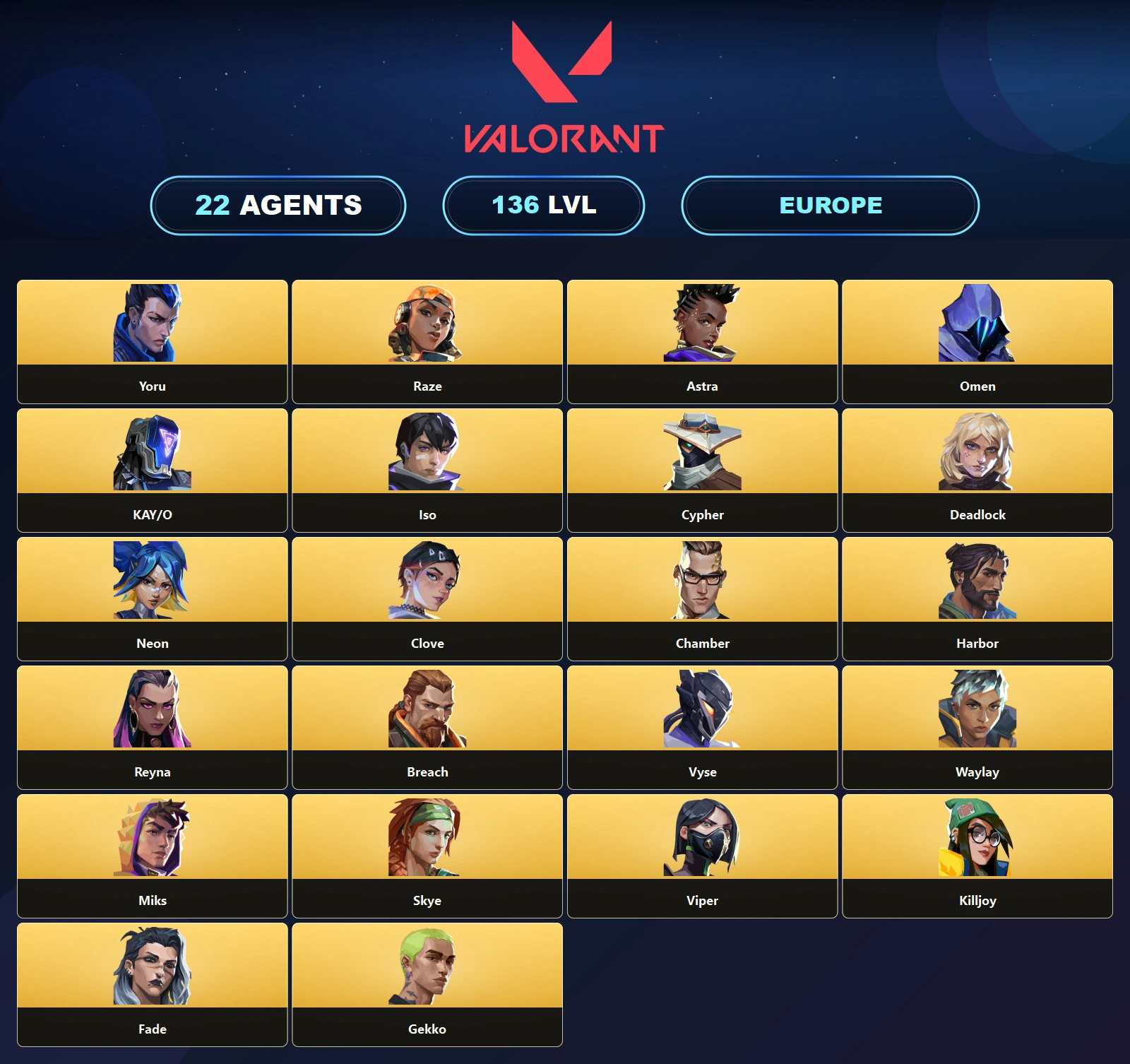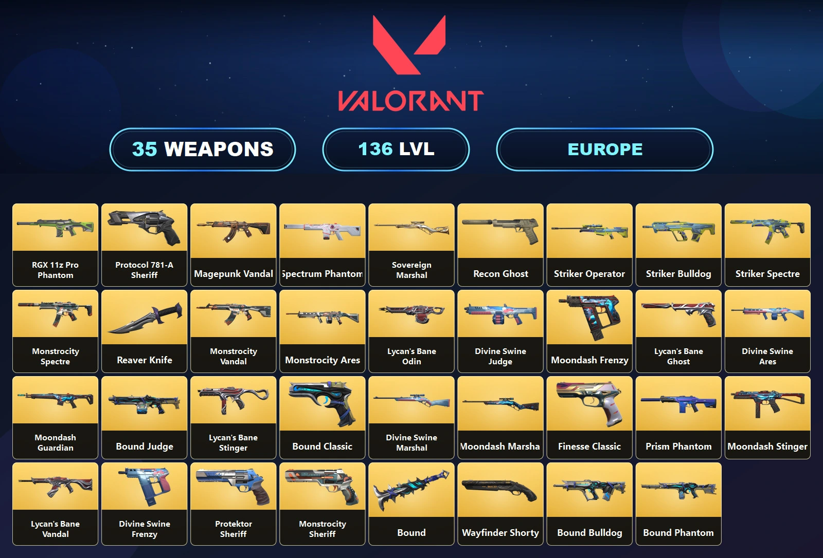 EU 🎪 35 Skins 🧊 136 Level 🪐 Reaver Knife 🥪 RGX 11z Pro Phantom 🚍 Spectrum Phantom 🎯 Magepunk Vandal 🐩 Monstrocity Vandal 👢 Prism Phantom 🐔 Lycan's Bane Vandal 👚 Unranked 🌊 22 Agents