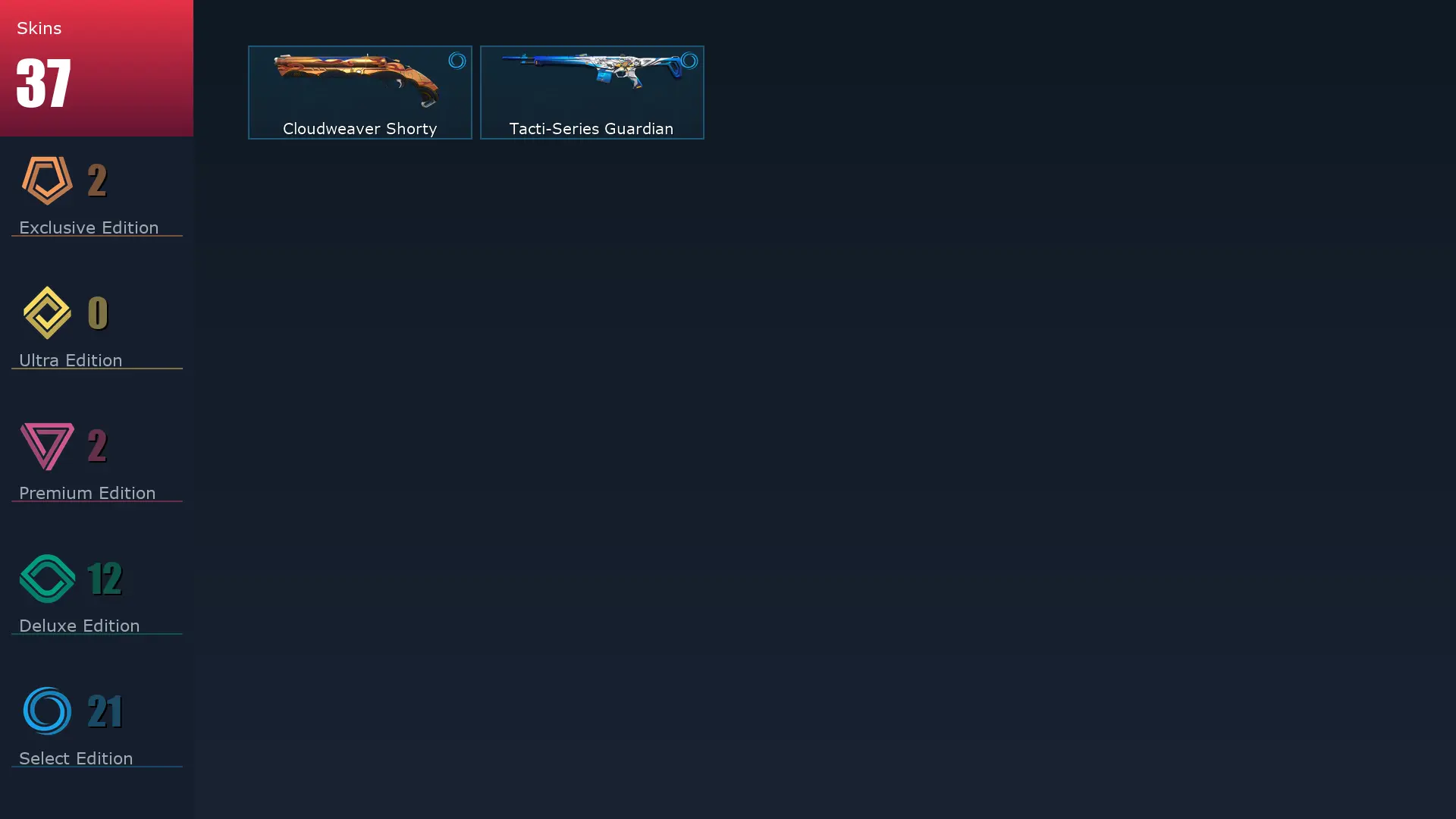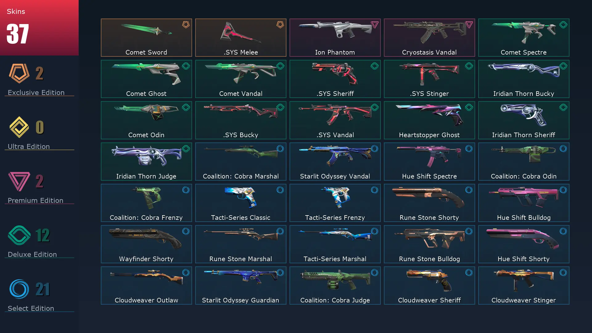 EU 👚 37 Skins 🍔 25 Agents 🥛 99 Level 🫖 Comet Sword 🐲 Coalition: Cobra Odin 🌠 Ion Phantom 💊 Coalition: Cobra Frenzy 🥢 Starlit Odyssey Vandal 🙂↔️ Comet Ghost 🫐 Hue Shift Spectre 🏤 Comet Spectre 🛹 Coalition: Cobra Marshal