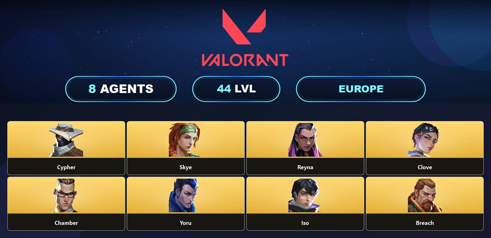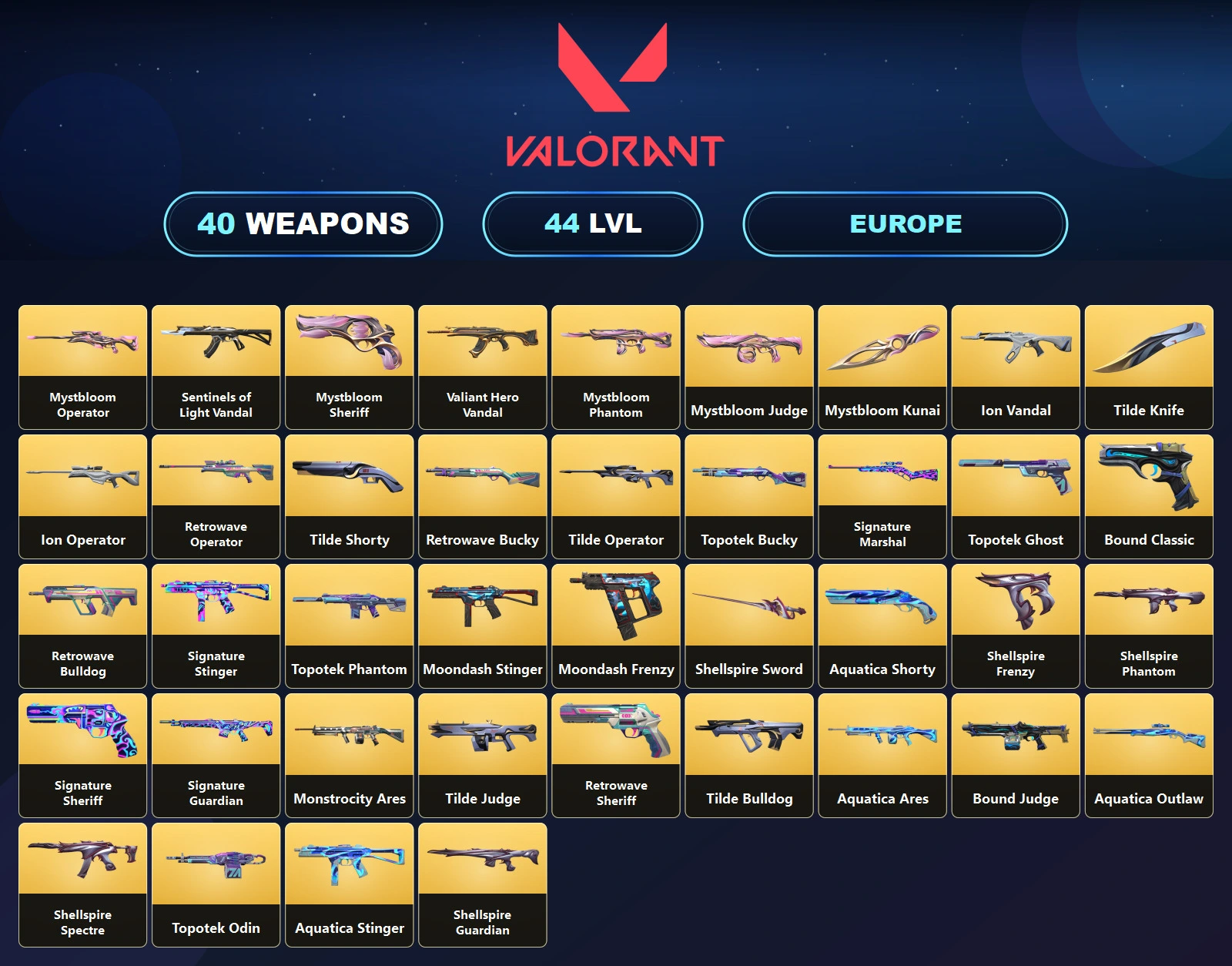 EU 🐩 40 Skins 🌙 44 Level 🐔 Ion Vandal 🌊 Ion Operator 🤞 Sentinels of Light Vandal 💠 Valiant Hero Vandal 🎲 Mystbloom Phantom 🍋 Topotek Phantom 👢 Shellspire Phantom 🍒 Unranked 🚍 8 Agents