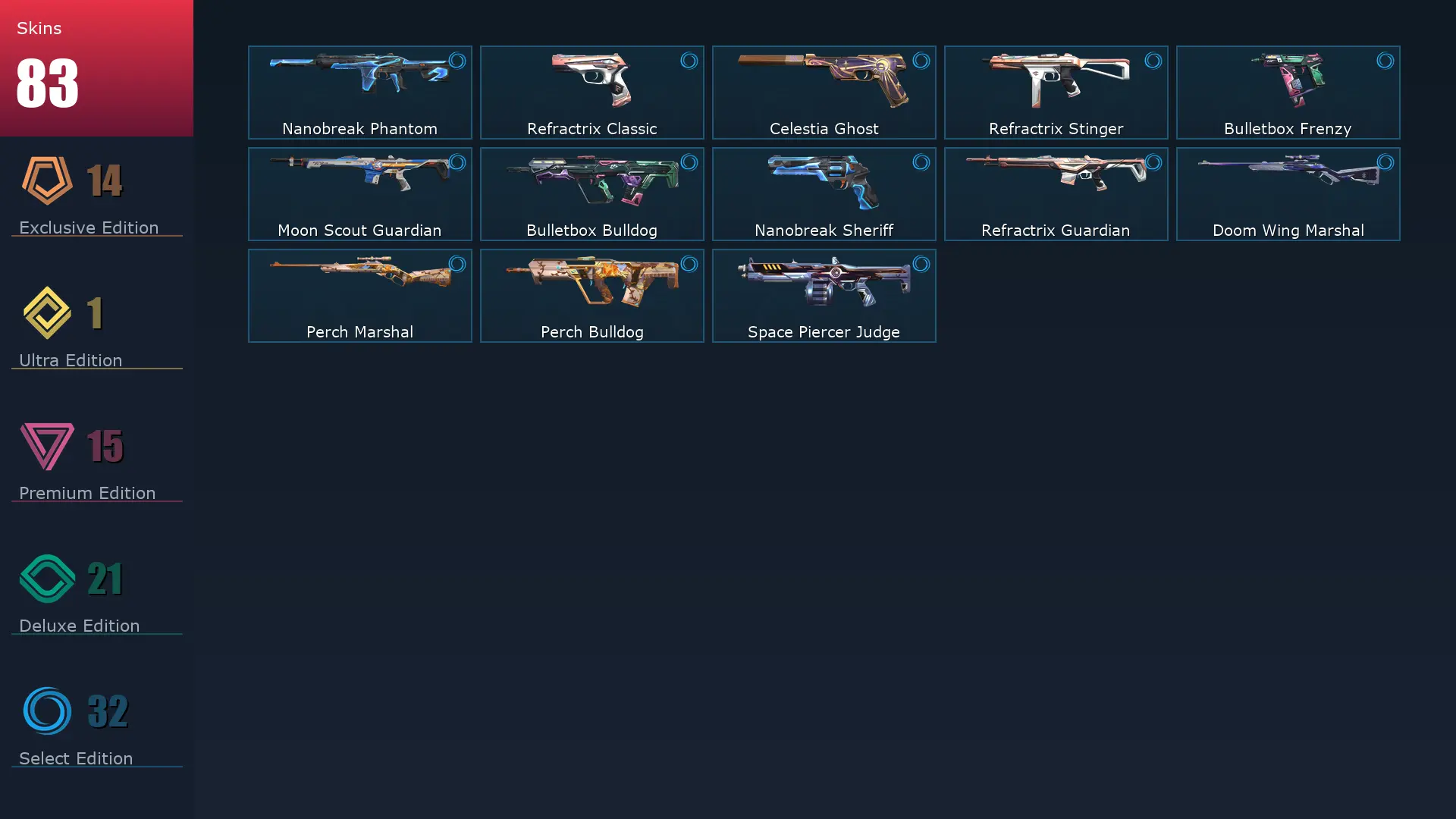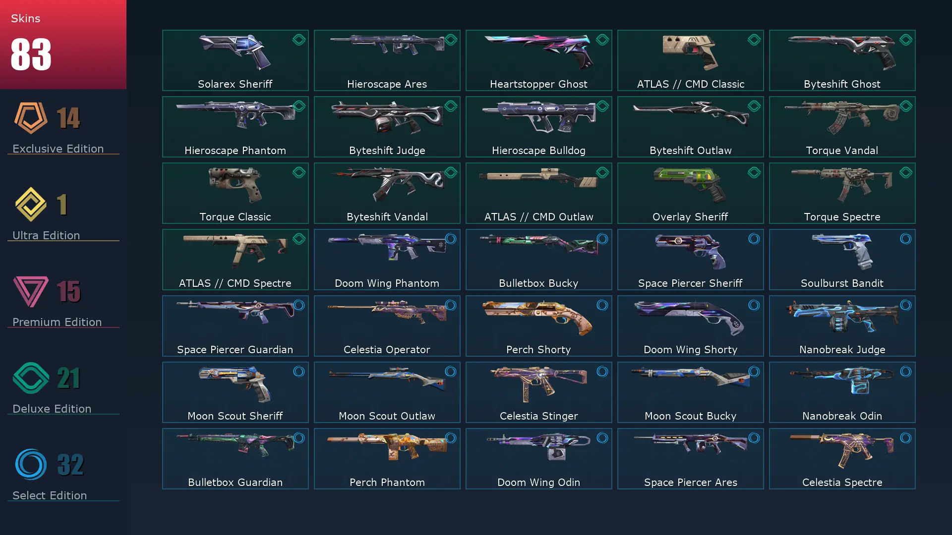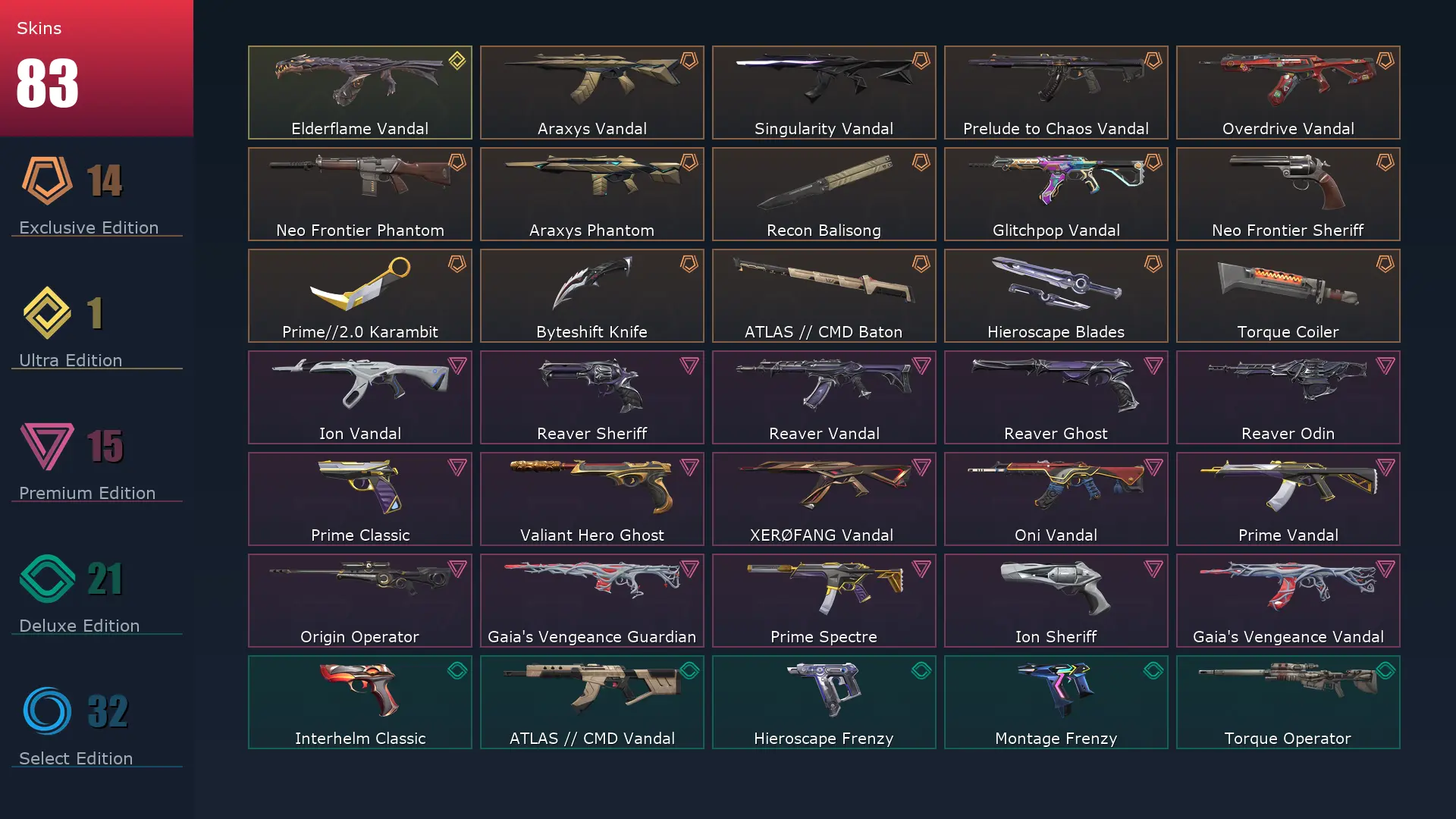 EU 🗼 83 Skins 🦐 Ascendant 1 🧳 29 Agents ⌚️ 252 Level 🫣 Reaver Vandal 🧨 Singularity Vandal 🫥 Glitchpop Vandal 🛥 Neo Frontier Phantom 🚰 Recon Balisong 🐦⬛ Gaia's Vengeance Vandal 🥵 Araxys Phantom 🤨 XERØFANG Vandal 🥚 Reaver Ghost