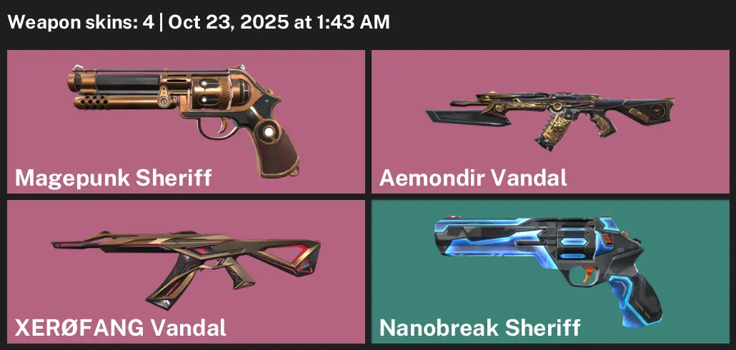 🚜 EU 🤲 Silver 1 🚇 4 Skins 🥽 244 VP 🐫 10 Agents 👋 Value: 5325 VP 😎 Magepunk Sheriff 🍍 Aemondir Vandal 🐿 XERØFANG Vandal 🩲 Nanobreak Sheriff