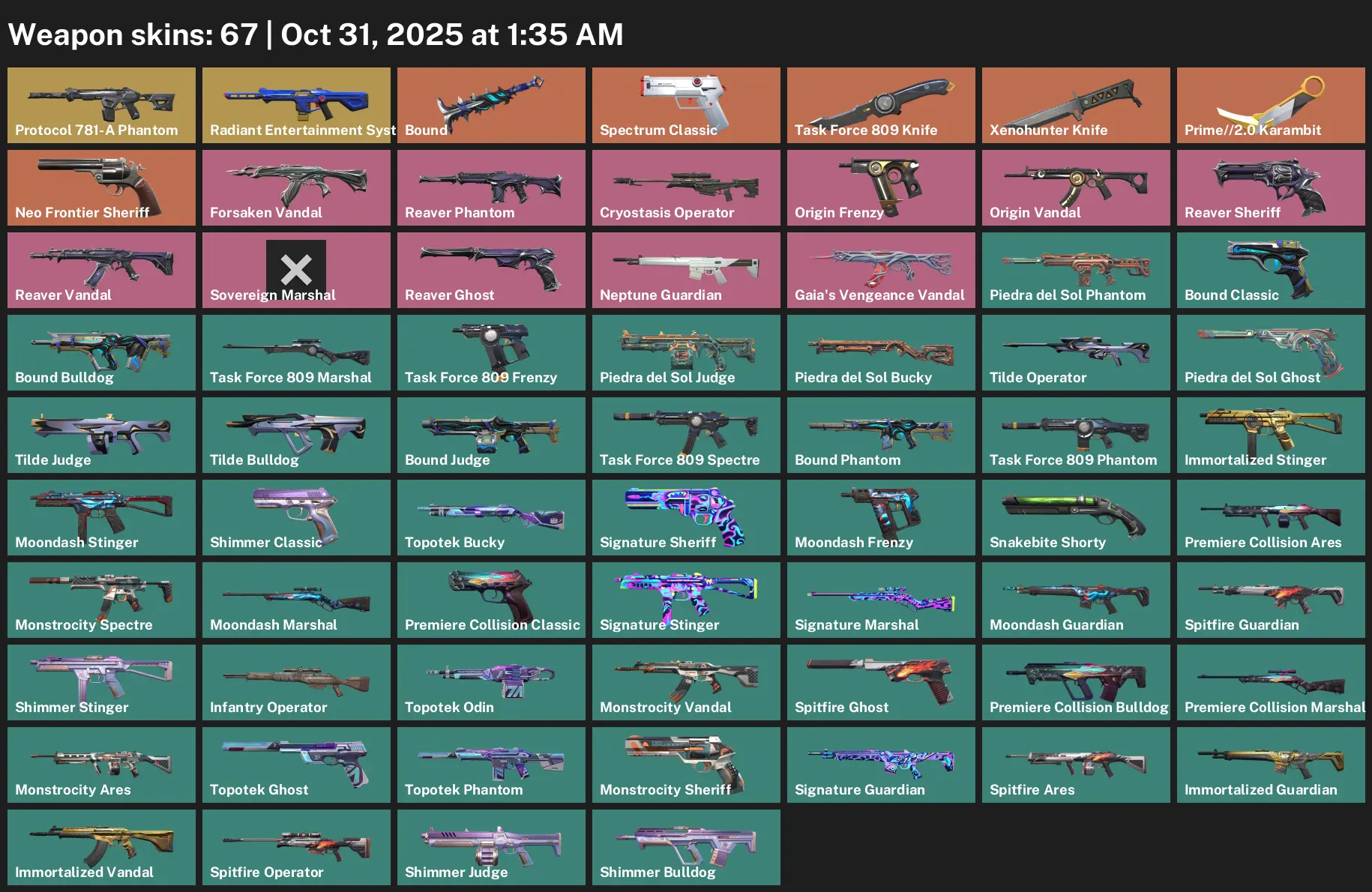 🧺 EU 🙂↔️ Unranked 🥗 67 Skins 🚞 509 VP 🎲 21 Agents 🍄 Value: 37800 VP ⚾️ Protocol 781-A Phantom 💎 Radiant Entertainment System Phantom 🐨 Bound 🚴 Spectrum Classic 🍹 Task Force 809 Knife 🎽 Xenohunter Knife