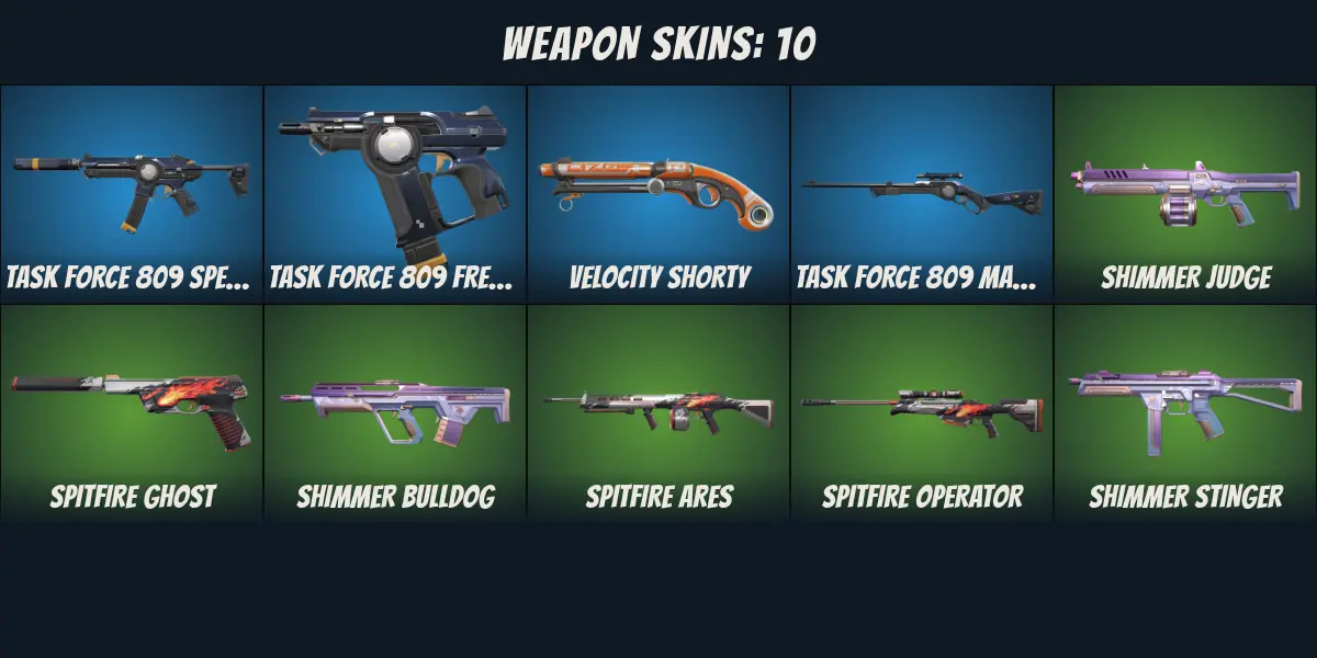 ⚡LA⚡ Unranked 💎 10 Skins 💎 Task Force 809 Spectre 💎 Task Force 809 Frenzy 💎 Velocity Shorty 💎 Task Force 809 Marshal 💎 Shimmer Judge 💎 Spitfire Ghost 💎 Shimmer Bulldog 💎
