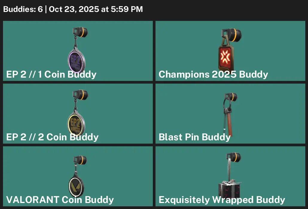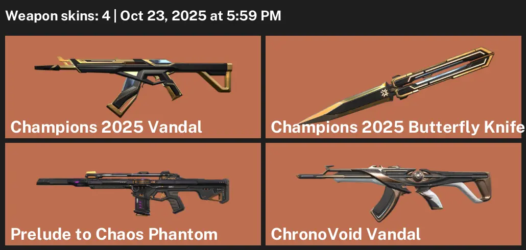 🏂 NA 🙀 Unranked 😈 4 Skins 🐭 10 VP 🤬 3 Agents ☀️ Value: 12375 VP 🧿 Champions 2025 Vandal 🤫 Champions 2025 Butterfly Knife 🧨 Prelude to Chaos Phantom 🩲 ChronoVoid Vandal