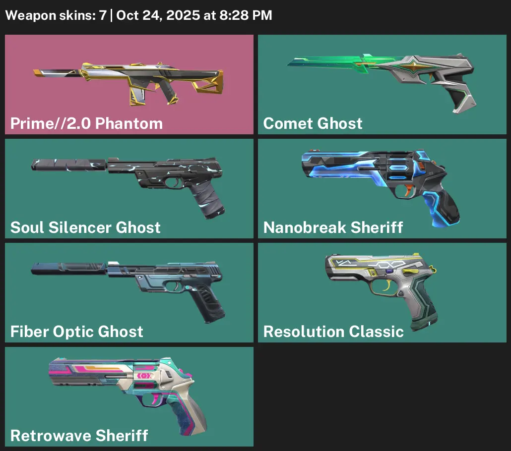 🦄 NA 🪹 Unranked 🙀 7 Skins 🐗 275 VP 🏎 22 Agents 🙄 Value: 1775 VP 📁 Prime//2.0 Phantom 🩰 Comet Ghost 🪣 Soul Silencer Ghost 🥨 Nanobreak Sheriff 🦬 Fiber Optic Ghost 🫴 Resolution Classic