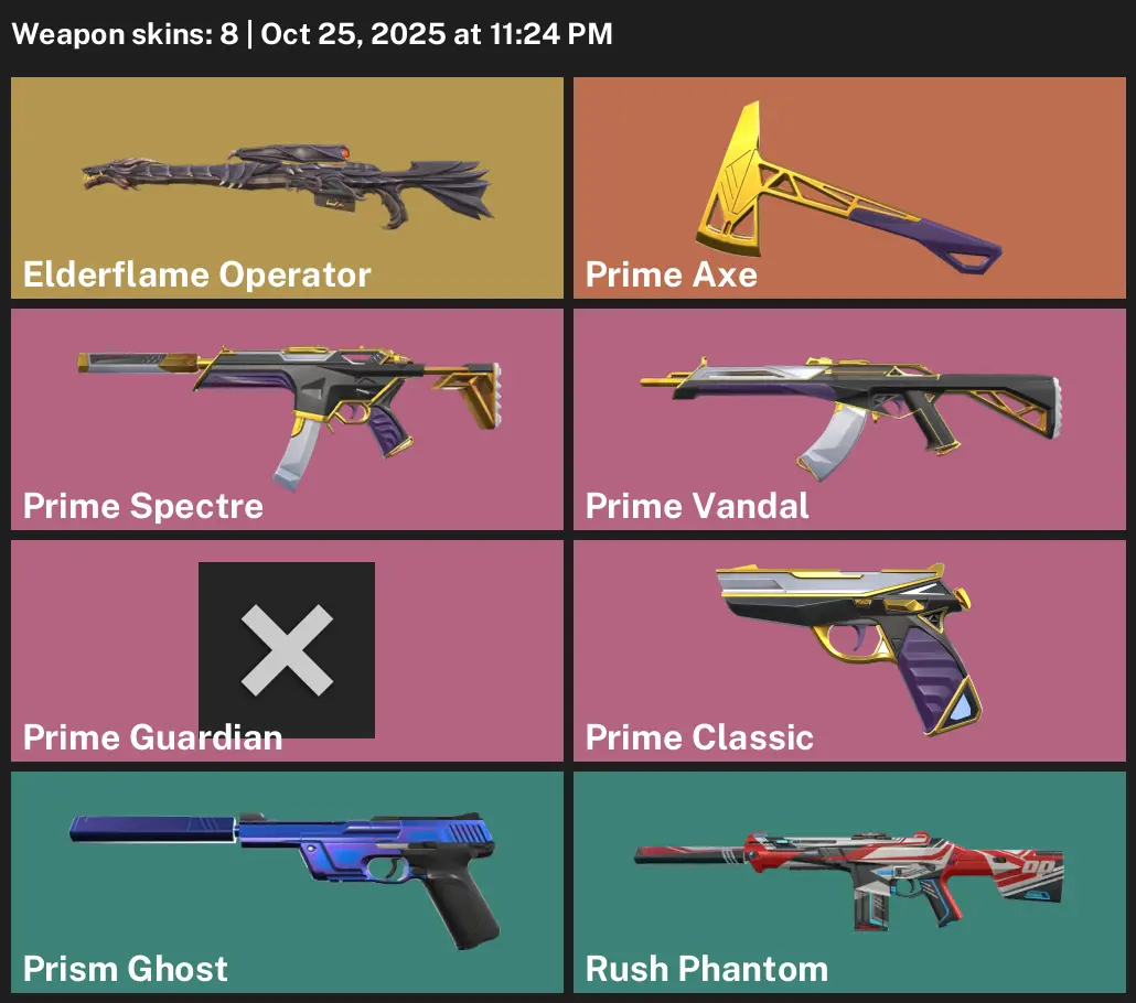 🚏 NA 📠 Unranked 👘 8 Skins 🏆 525 VP 🎬 2 Agents 🪹 Value: 15275 VP 😩 Elderflame Operator 🤺 Prime Axe 🚝 Prime Spectre 💍 Prime Vandal 🛹 Prime Guardian ⚙️ Prime Classic