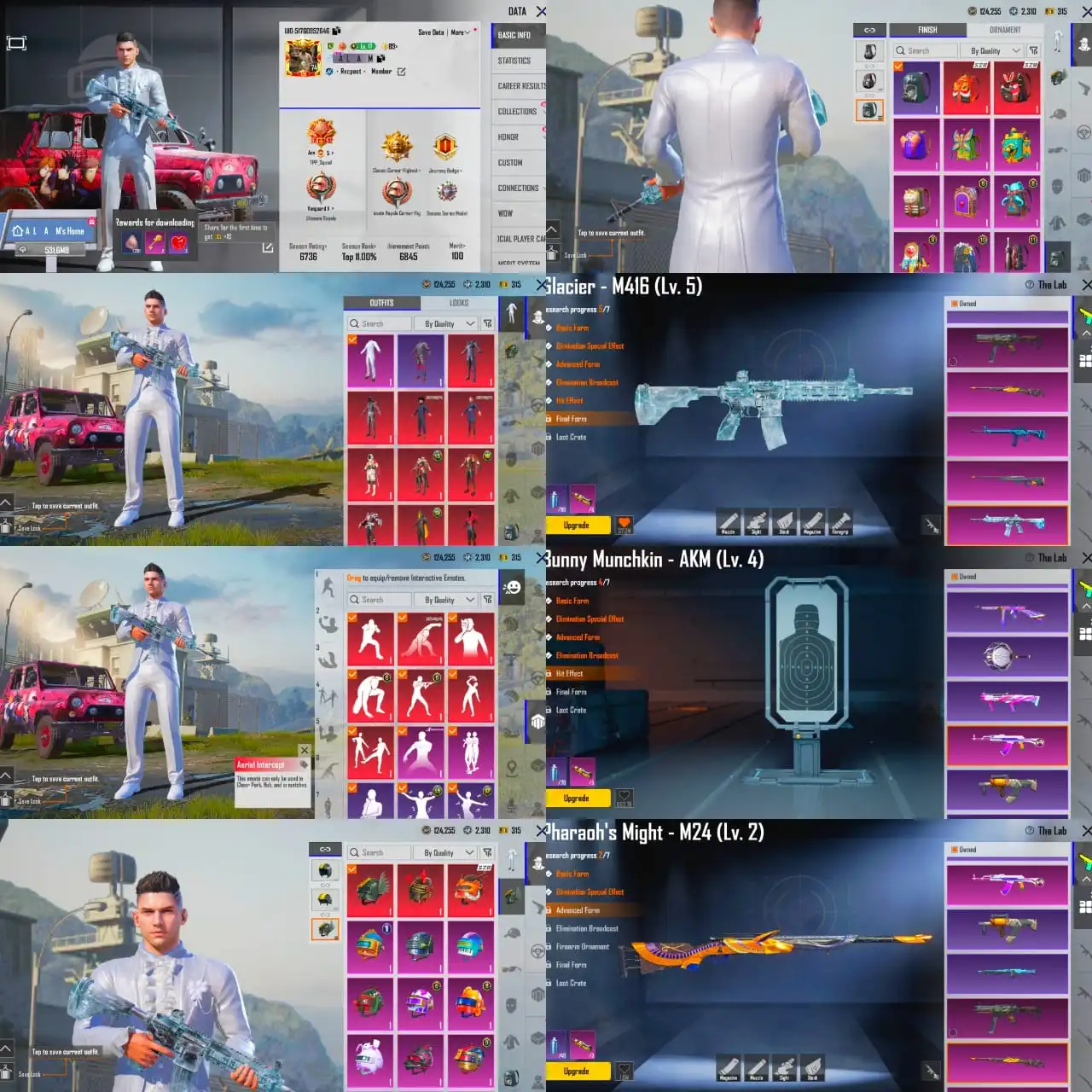 | 74 LVL|57 MYTHIC|CONQUERER|M416 GLACIER LVL 5|AKM LVL 4|M24 LVL 2|WEDDING SET|25 X GUN LAB|