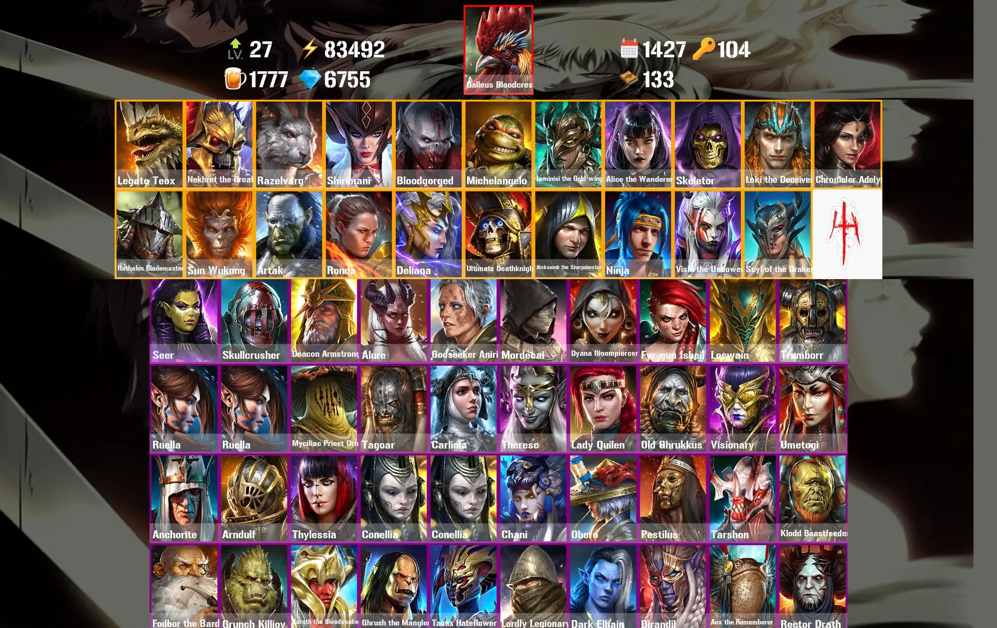 1427 Days 83.5k Energy [Mythical Starter] Galleus Bloodcrest βΈ± Legate Teox βΈ± Nekhret the Great βΈ± Razelvarg βΈ± Shirimani βΈ± Bloodgorged βΈ± Seer βΈ± Skullcrusher βΈ± 56.4m Silver βΈ± 6.8k Gems