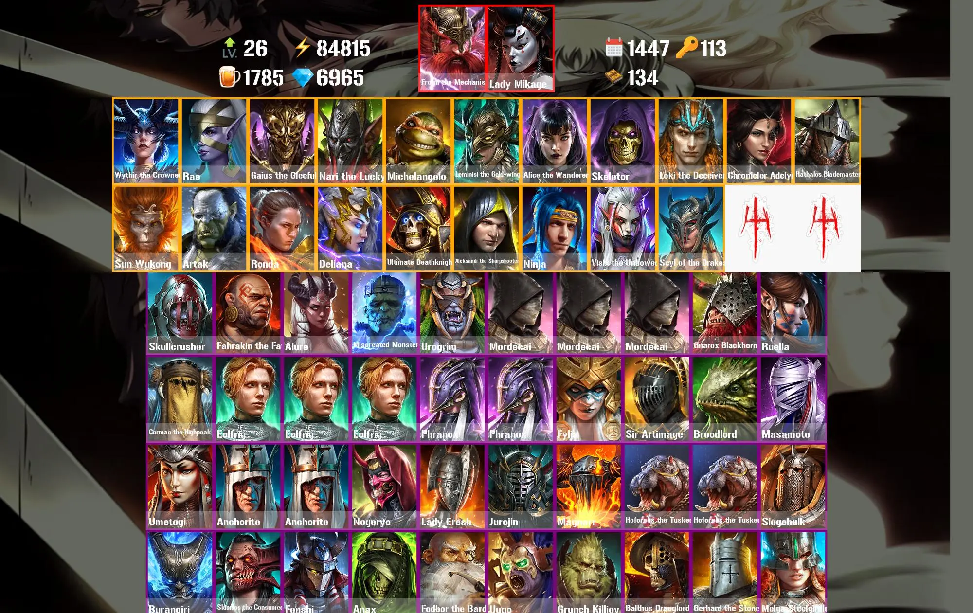 1447 Days 84.8k Energy [Mythical Starter] Frolni the Mechanist βΈ± Lady Mikage βΈ± Wythir the Crowned βΈ± Rae βΈ± Gaius the Gleeful βΈ± Nari the Lucky βΈ± Michelangelo βΈ± Skullcrusher βΈ± Fahrakin the Fat βΈ± 51.9m Silver βΈ± 7.0k Gems