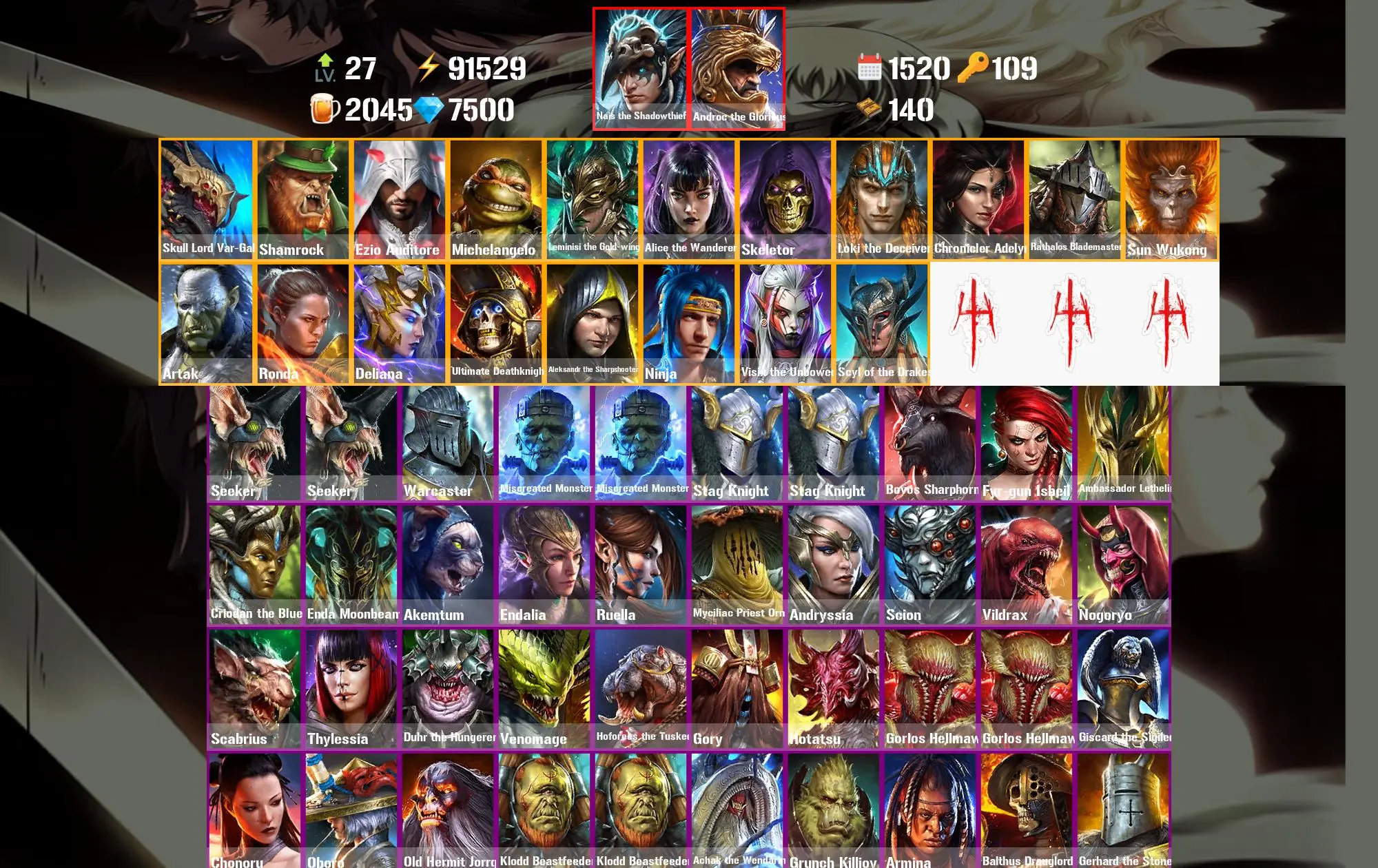 1520 Days 91.5k Energy [Mythical Starter] Nais the Shadowthief ⸱ Androc the Glorious ⸱ Skull Lord Var-Gall ⸱ Shamrock ⸱ Ezio Auditore ⸱ Michelangelo ⸱ Leminisi the Gold-wing ⸱ Seeker ⸱ Seeker ⸱ 63.3m Silver ⸱ 7.5k Gems