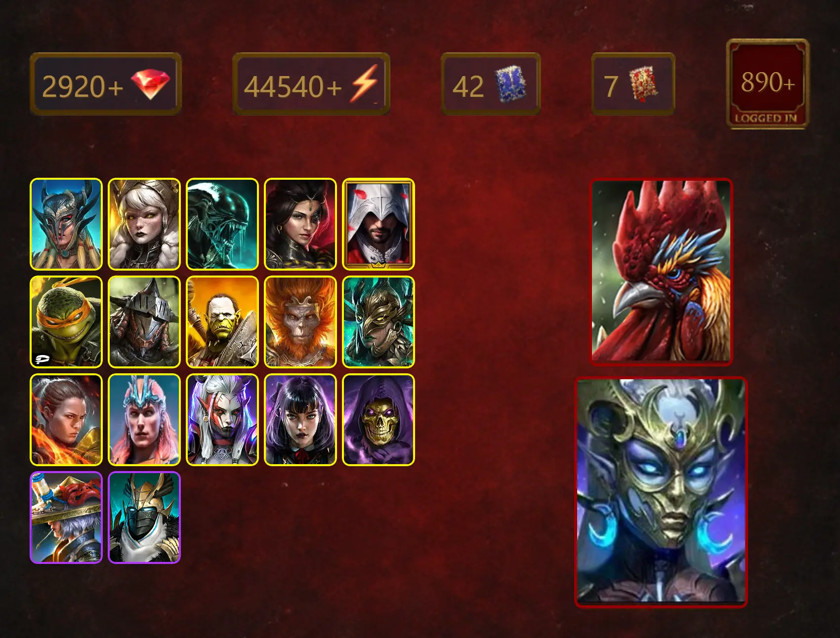 [STARTER][Double Mythical]+Galleus Bloodcrest+Arachoa Moonspinner+Scyl+Senna Amberheart+Xenomorph+Adelyn+Ezio Auditore+48Epics