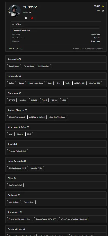๐ฎ PC/PSN โ Level 301 โ Elite BLACK ICE Veteran ๐ โ 6x BLACK ICE + Legendary Skins + Elite Ash ๐ฅ โ Instant Delivery โก
