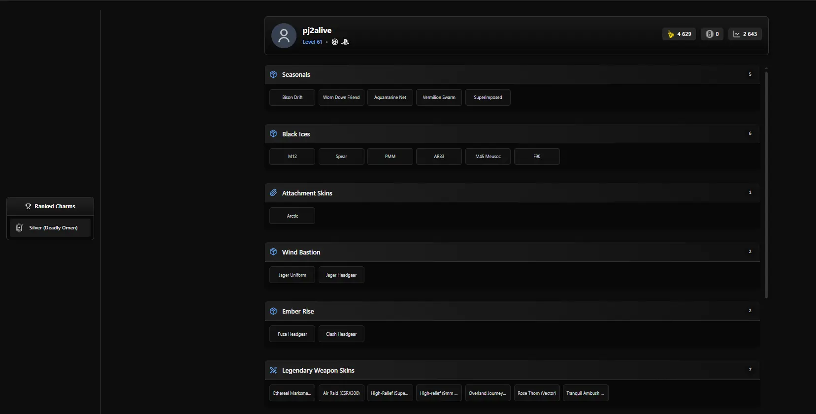 [PC/XBOX] LvL: 61 | Ranked Ready | 1x Silver | Black Ice (6) | Wind Bastion (2) | Ember Rise (2) | Legendary Skins (7) | Epic Skins (10) | x Operator | 4k Renown #R11