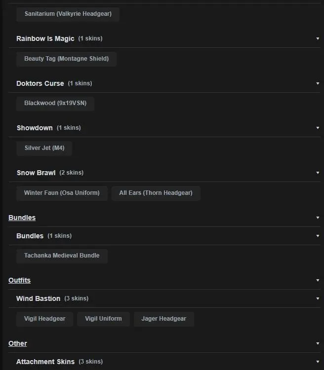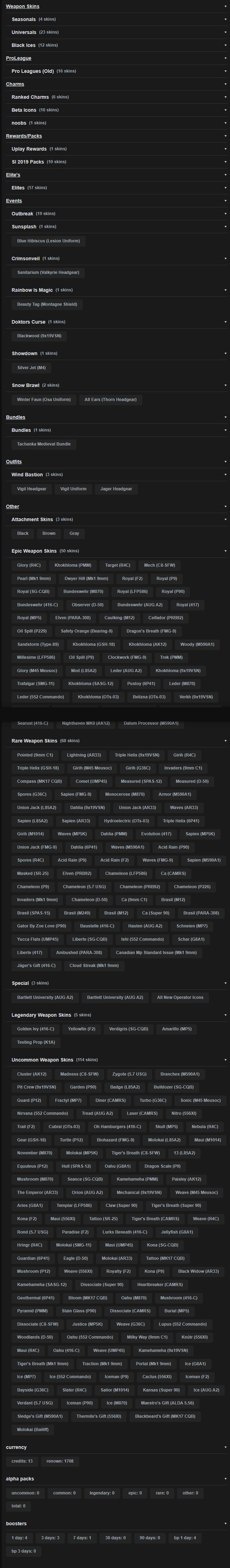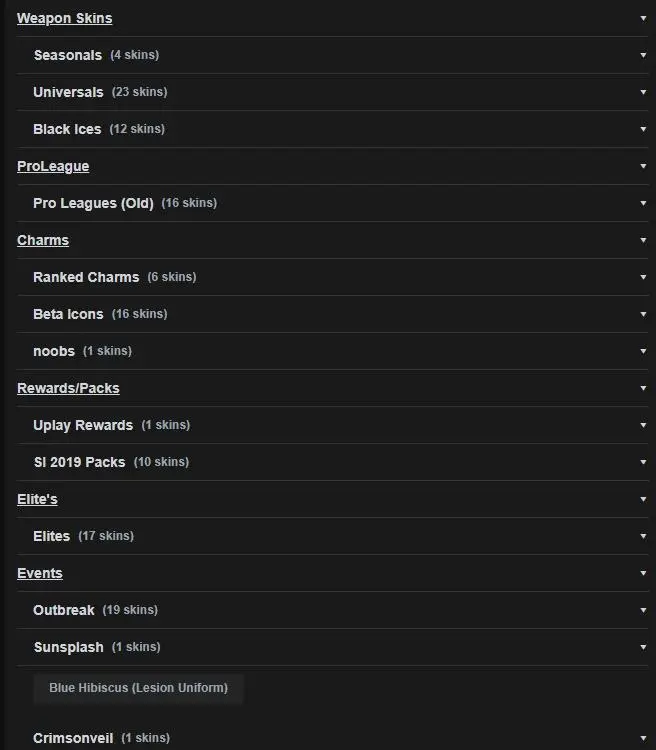| 50 Operators | 12x Black Ice | 23 Universal Skins | 16 Pro League Sets | 17 Elite |