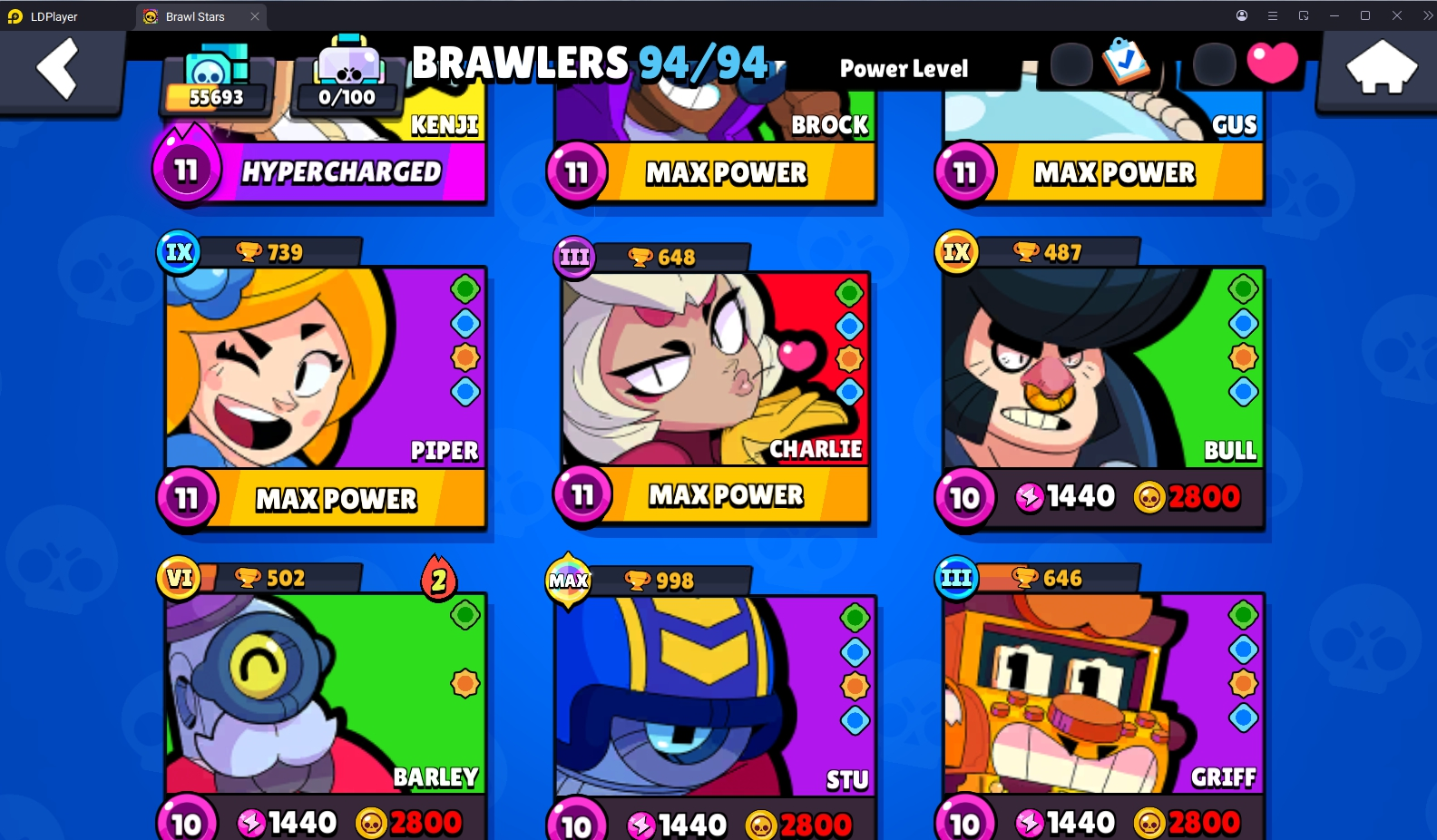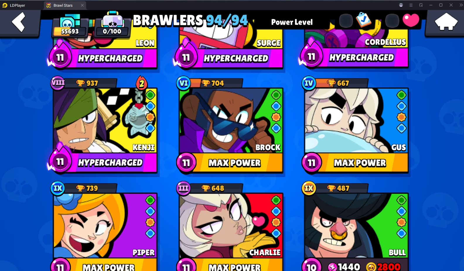 228 SKINS 💯 55.693 TROPHIES 🏆 94 BRAWLERS 🐼 22 HYPERCHARGED 🩸 26 MAX BRAWLERS 💛 NIGHT MECHA CROW 🧡 FURIOUS FANG 🧡 STELLAR SHELLY 🧡 CURSED KENJI 🧡 ODIN CORDELIUS 💯