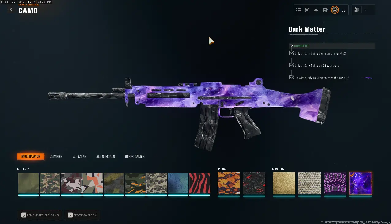 All 33 BO6 Dark Matter legit 🧊 Prestige 1 Level 55 🥍 Diamond camo set 🔦 Dark Spine equipped 🎨 Gold camo unlocked 🎧 Works on all platforms 🪙 SaintStore Guarantee 🌟 HandLevelled