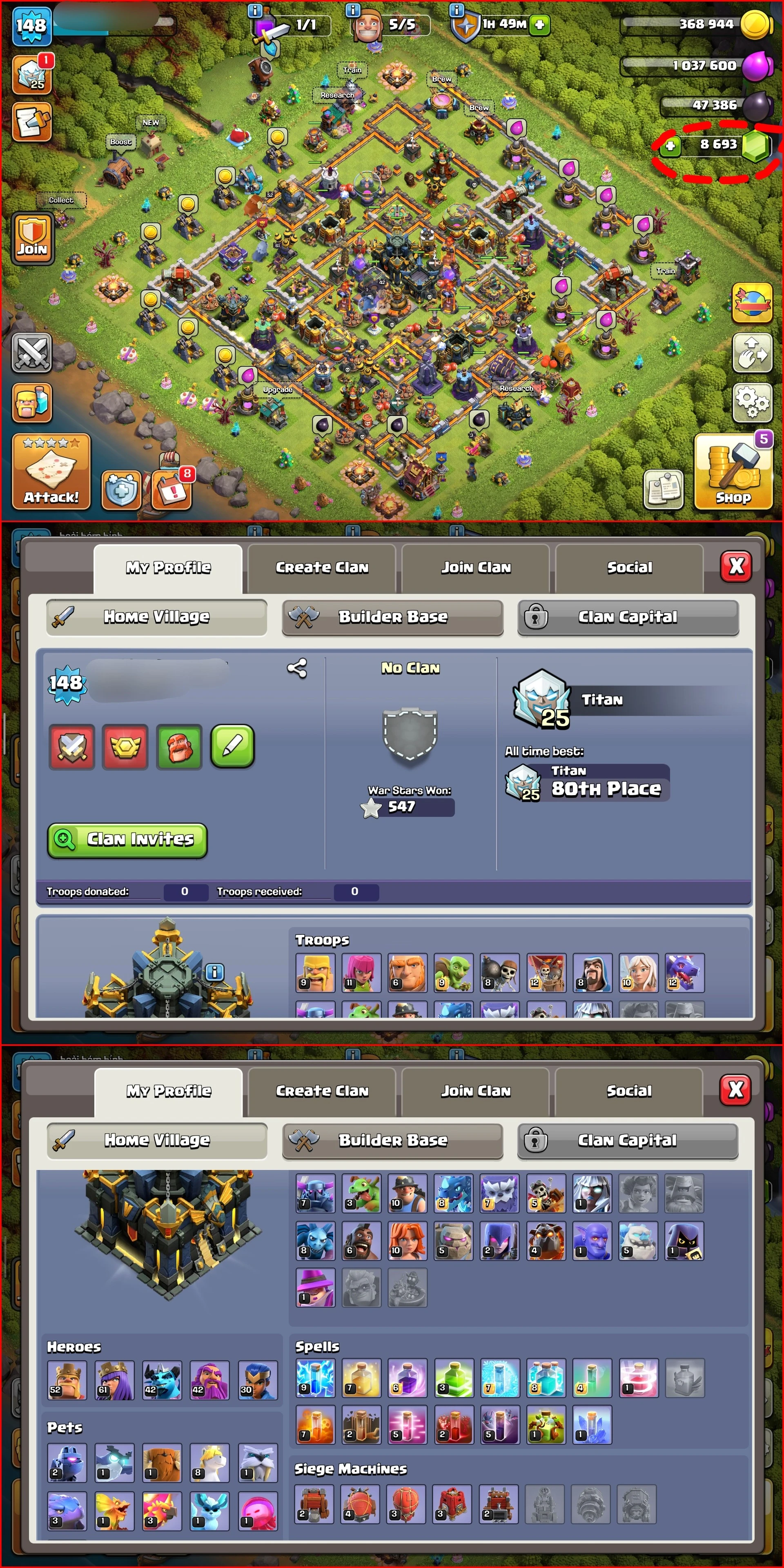 8.6K+ GEMS TH17 DONATION I'D |52/61/42/42/30 | Hefty Abilities { 9/13 Epics } + Strong Troops | RB434