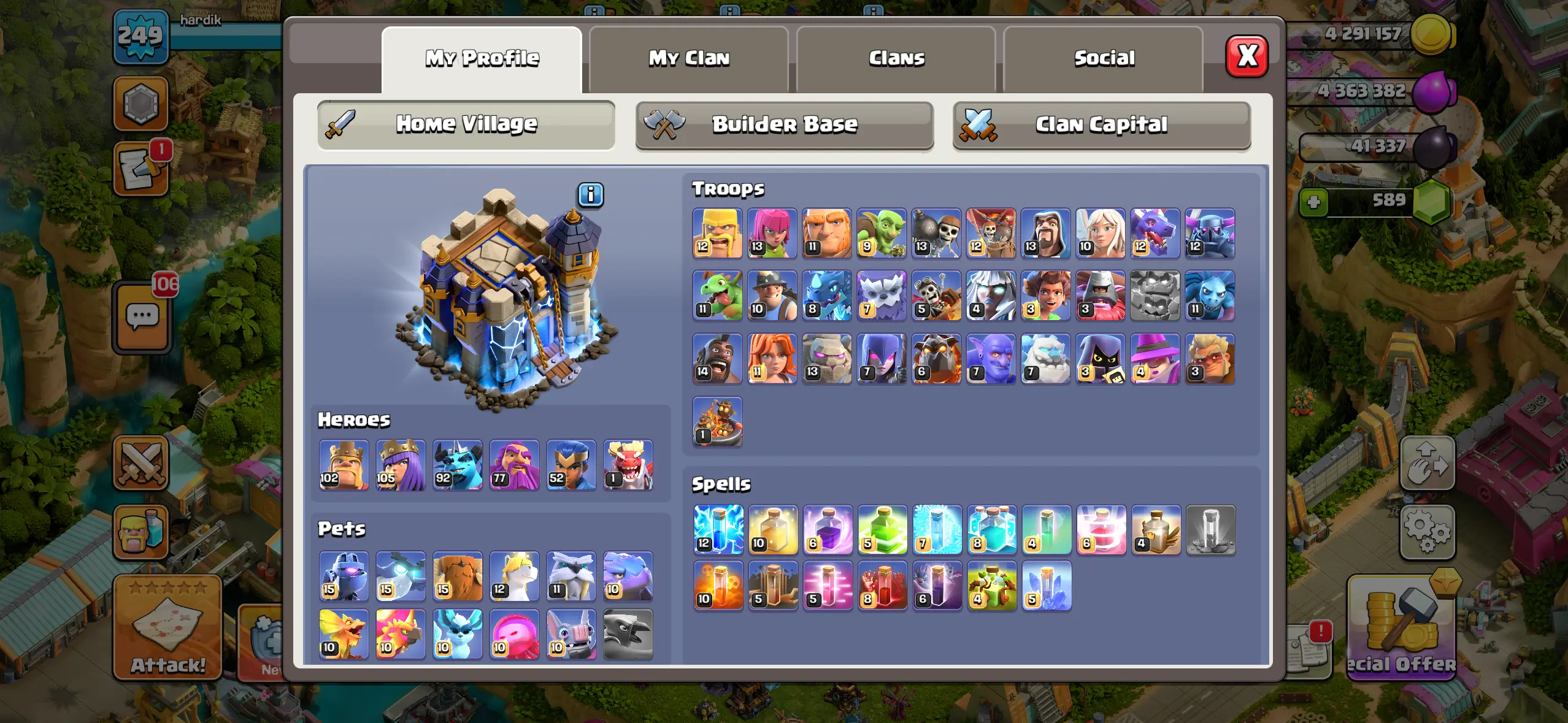TH18 Max⚡ US Local ⚡️Name Change Available 💎 Exp 249 🔥70+ Skins & Scenery 🔥Epic Equipments | Max BH 🔥High Heroes 🔥High Magic items 🔥Instant Delivery