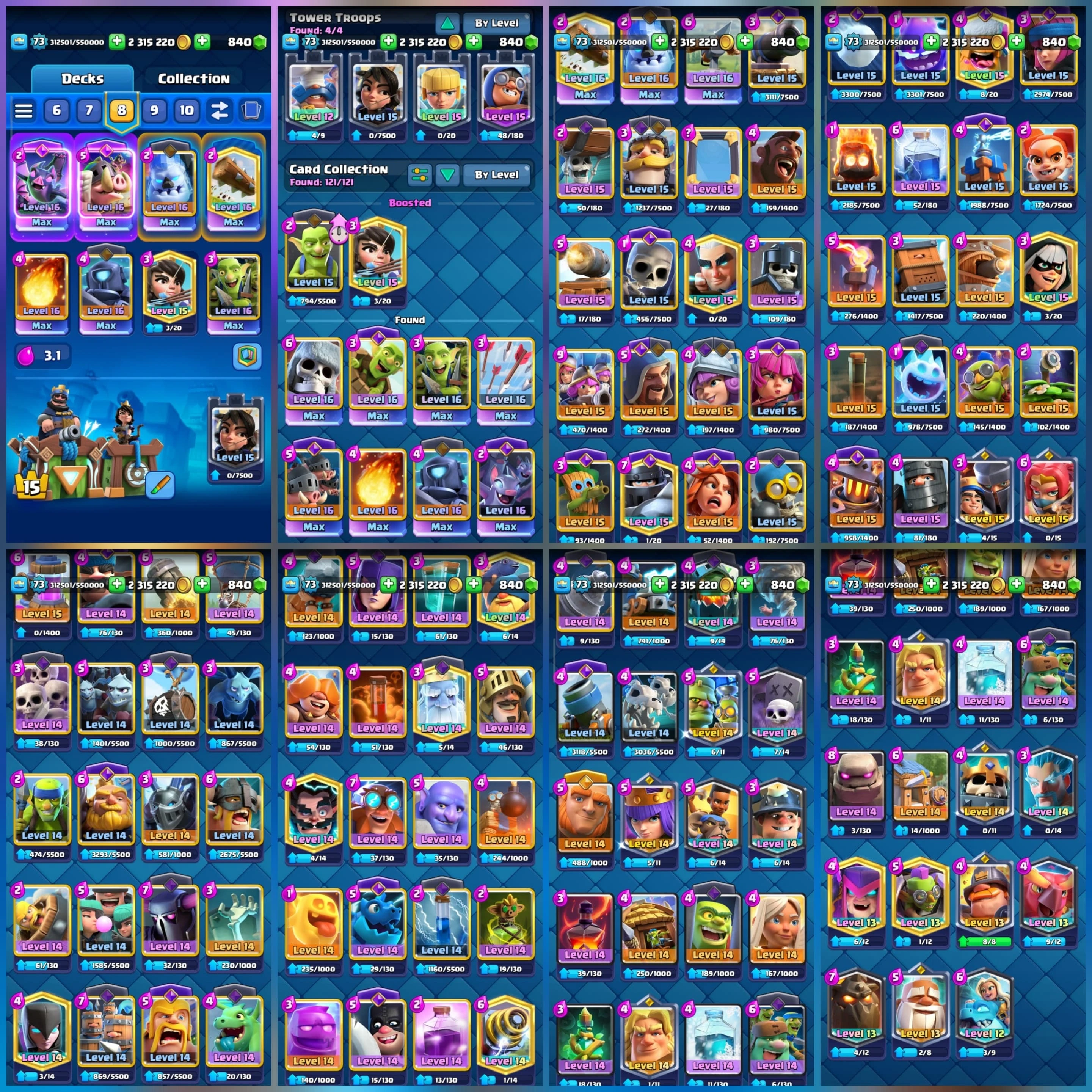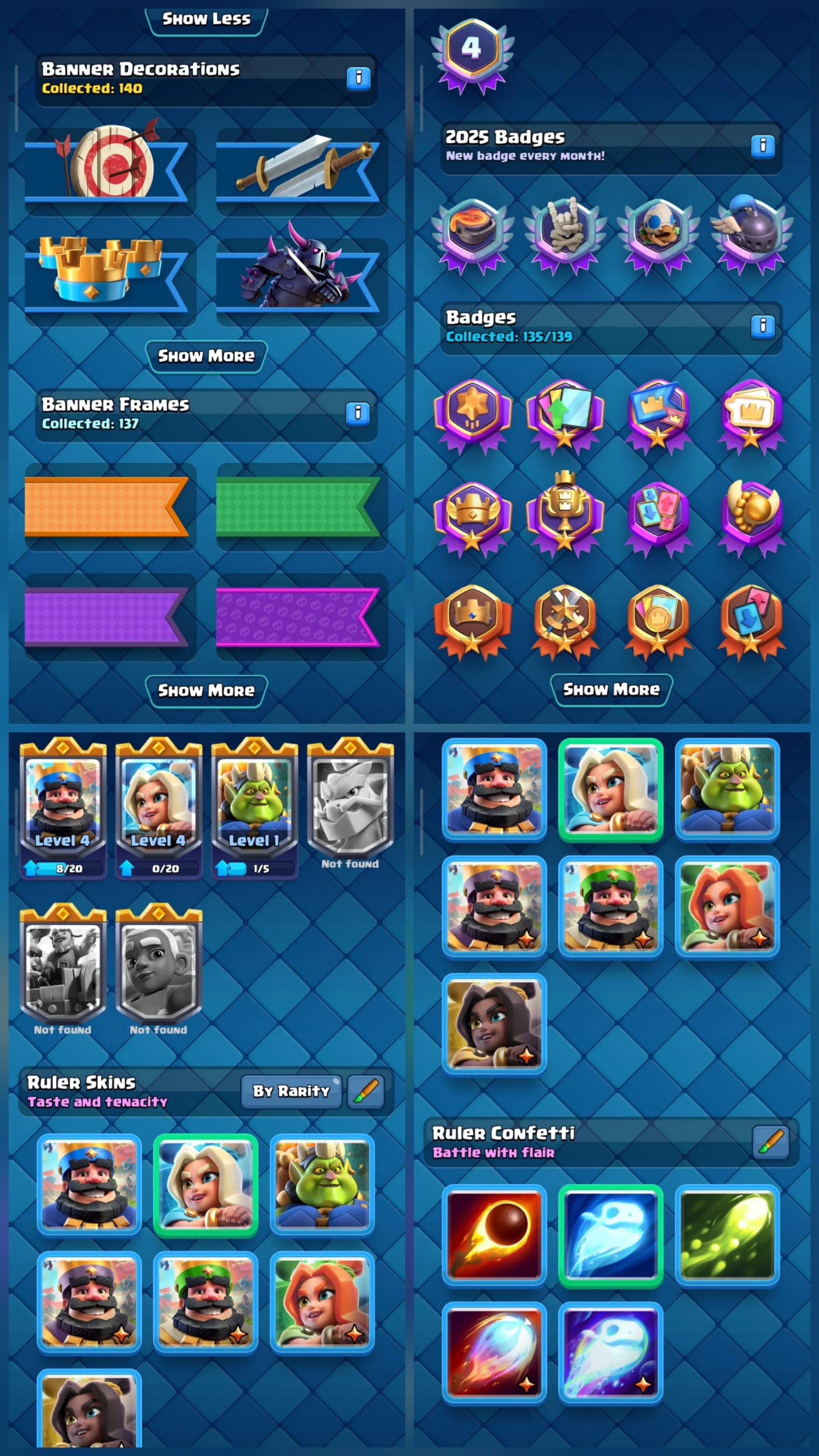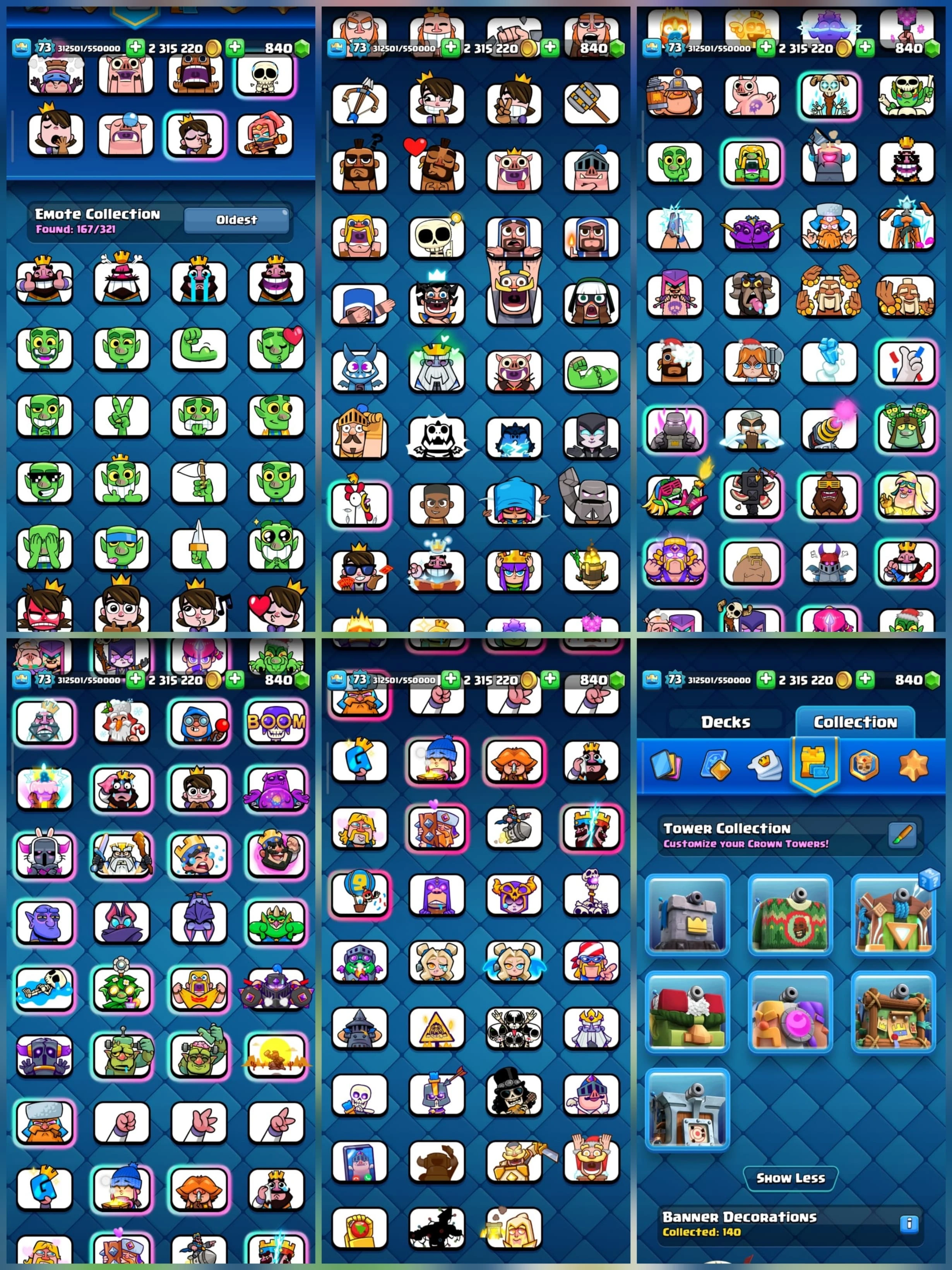 4 YR OLD CR, 12000 TROPHY, [11 ⸱ Level 16], [39 ⸱ Level 15], [64 ⸱ Level 14],1 HERO, 21 EVO, 167 RARE EMOTE, 7 TOWER , 135 BADGES, 137 FRAMES, 140 DECOR , ARENA 28, LEVEL 73 | H240